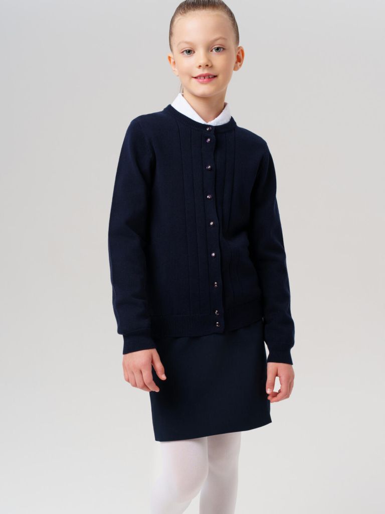 Прямой крой и удобная застёжка на пуговицы позволяют легко надевать темно-синий детский кардиган поверх рубашек, футболок или поло. Такая вязаная кофта в школу для подростков хорошо сочетается с юбками, брюками, сарафанами и жилетами из школьной коллекции.