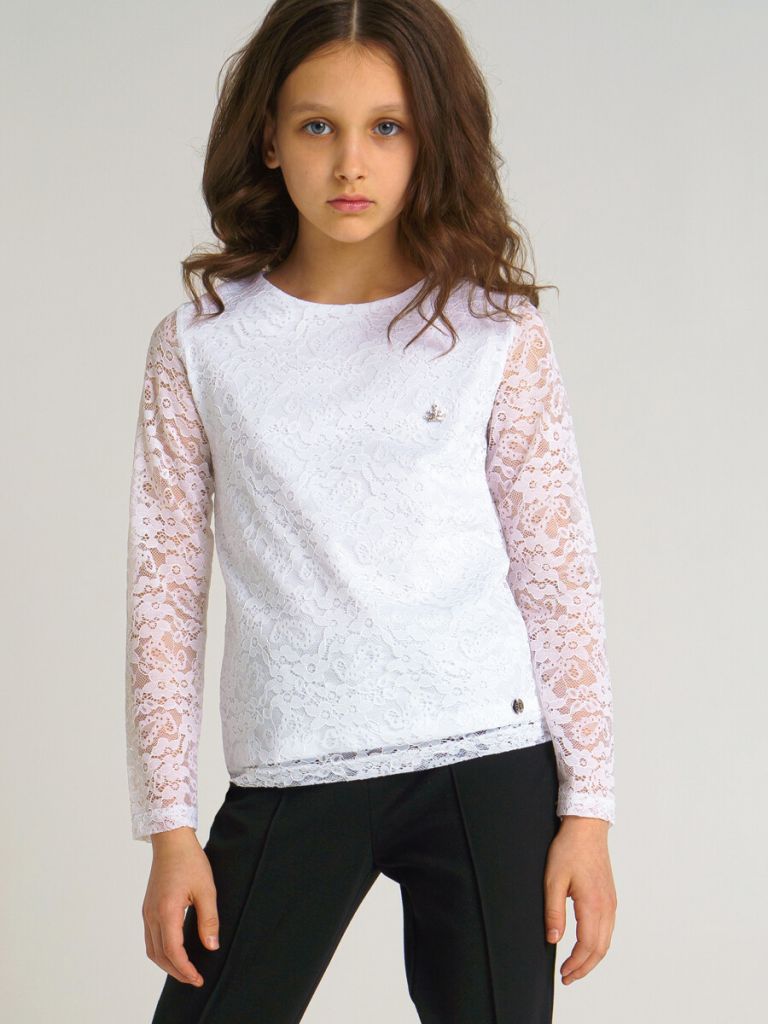 Белый трикотажный джемпер прямого силуэта для девочки подростка - прекрасная альтернатива текстильной блузке или рубашке. Школьная кофта очень мягкая и приятная на ощупь, хорошо держит форму, комфортна в носке и проста уходе. Высокое содержание хлопка 95%. Благодаря наличию эластана в составе ткани, изделие проще в уходе и держит форму. Джемпер в школу с длинным рукавом и декором из кружева разнообразит повседневные образы школьницы.