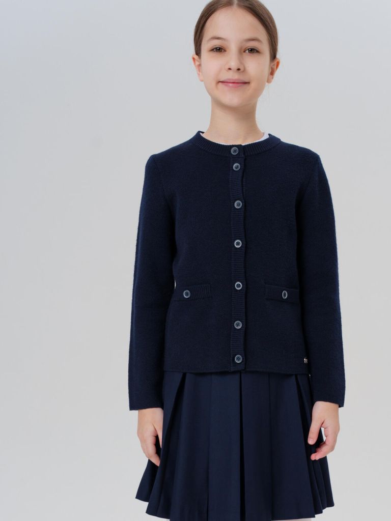 Классический темно-синий школьный кардиган на пуговицах для девочки подростка от PlayToday — стильная и универсальная вещь для школы и активных будней. Модель выполнена в классическом силуэте: прямой крой дарит комфорт и свободу движений, а лаконичный дизайн остаётся актуальным в любом сезоне.