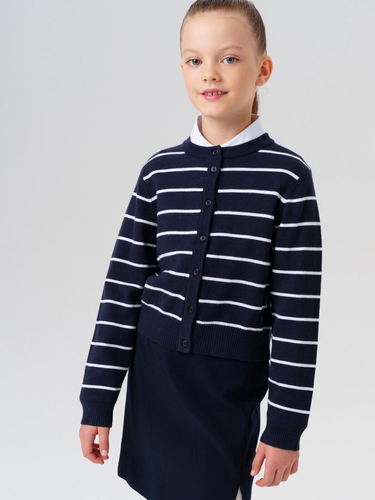Стильный тёмно-синий школьный кардиган в полоску на пуговицах для девочки подростка от PlayToday — универсальный элемент гардероба для школы и активных будней. Модель выполнена в классическом силуэте: удобный прямой крой и современный дизайн обеспечивают комфорт в движении и актуальный внешний вид.