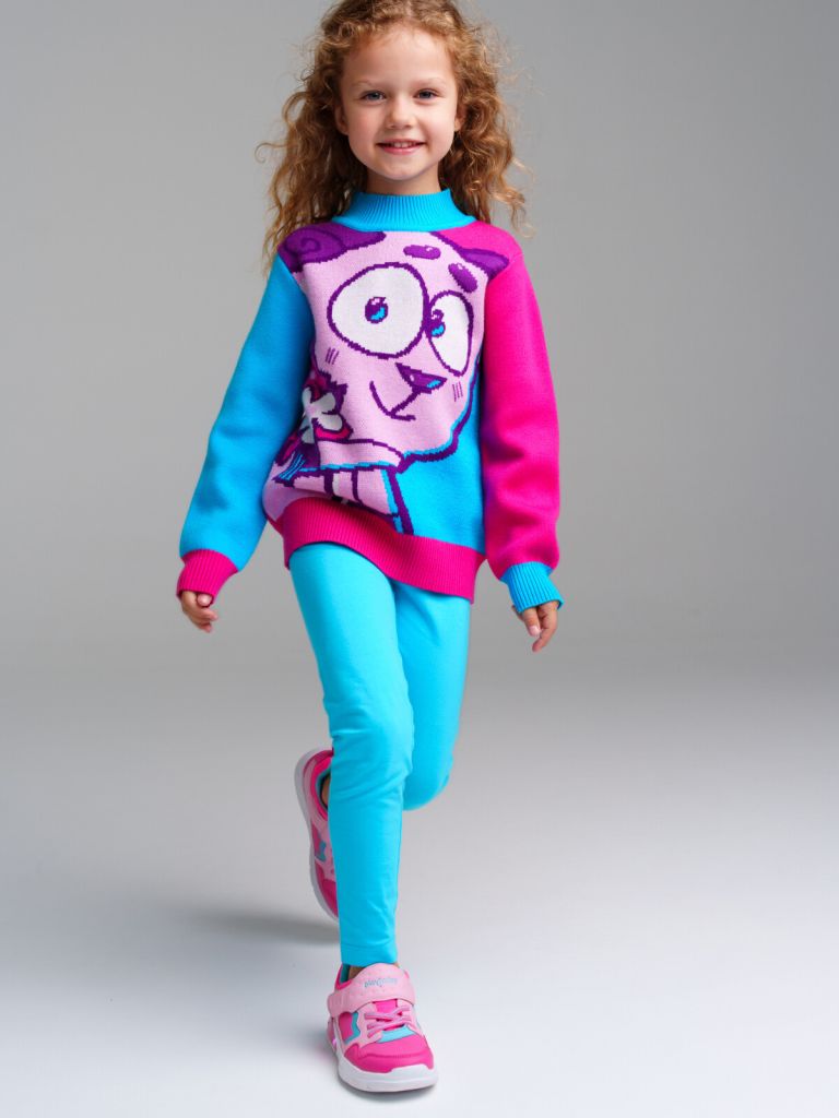 Свитер "Смешарики" из вязаного трикотажа. Высокое содержание вискозы 50%. Вискоза отличается высокой гигроскопичностью - она впитывает влагу и отлично сохраняет тепло. Воротник-стойка. Горловина, манжеты и низ изделия в рубчик.