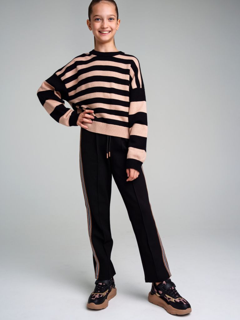Джемпер из вязаного трикотажа. 50% вискоза. Вискоза отличается высокой гигроскопичностью - она впитывает влагу и отлично сохраняет тепло. Горловина, манжеты и низ изделия в рубчик.
