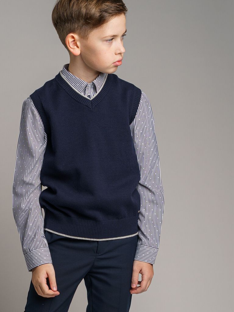 Классический синий школьный жилет для мальчика подростка. Жилет прямого силуэта выполнен из вязаного трикотажа с высоким содержанием хлопка, что обеспечивает максимальный комфорт для школьника во время занятий. Жилетка в школу выглядит стильно, благодаря лаконичному дизайну. С любой рубашкой, футболкой или поло, жилет для школьника составит красивый элегантный комплект для школы.