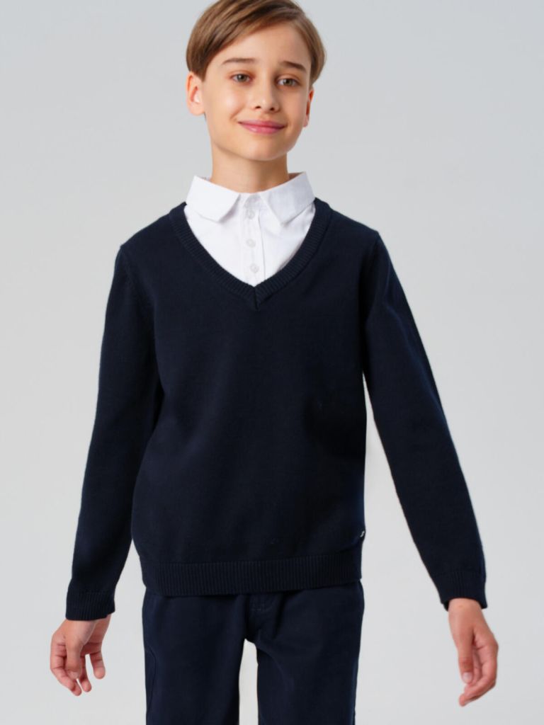 Этот классический подростковый джемпер для мальчиков объединяет в себе тепло трикотажа и строгий вид классической белой школьной рубашки. Благодаря встроенному текстильному элементу в зоне воротника и планки, создаётся эффект многослойности — как будто под этой стильной школьной кофтой для подростков надета аккуратная классическая сорочка для мальчика, но при этом ничего не мешает движению и не натирает.