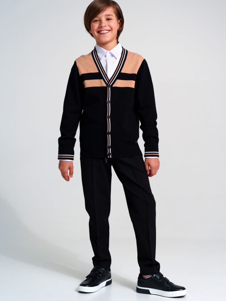 Классический коричневый школьный кардиган для мальчика подростка. Кардиган прямого силуэта на пуговицах выполнен из вязаного трикотажа с высоким содержанием хлопка. Кофта в школу выглядит стильно, благодаря колорблоку и бежевой отделке по планке, горловине и манжетам. Рубашка, футболка или поло + кардиган для школьника составят красивый элегантный комплект для школы.