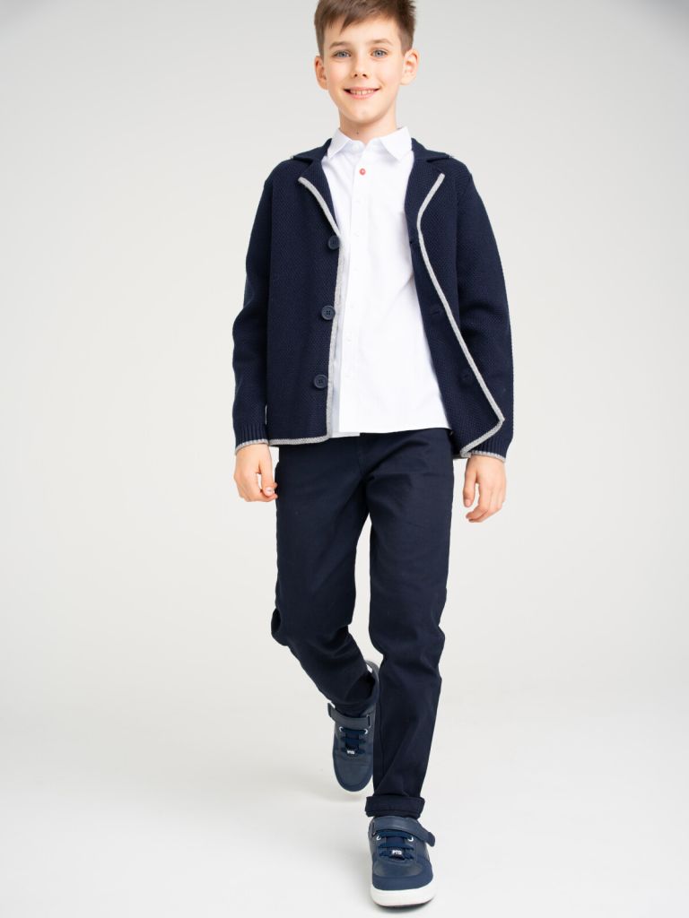 Классический синий школьный пиджак для мальчика подростка. Пиджак прямого силуэта на пуговицах выполнен из вязаного трикотажа с высоким содержанием акрила. Кофта в школу выглядит стильно, благодаря лаконичному дизайну. Рубашка, футболка или поло + пиджак для школьника составят красивый элегантный комплект для школы.