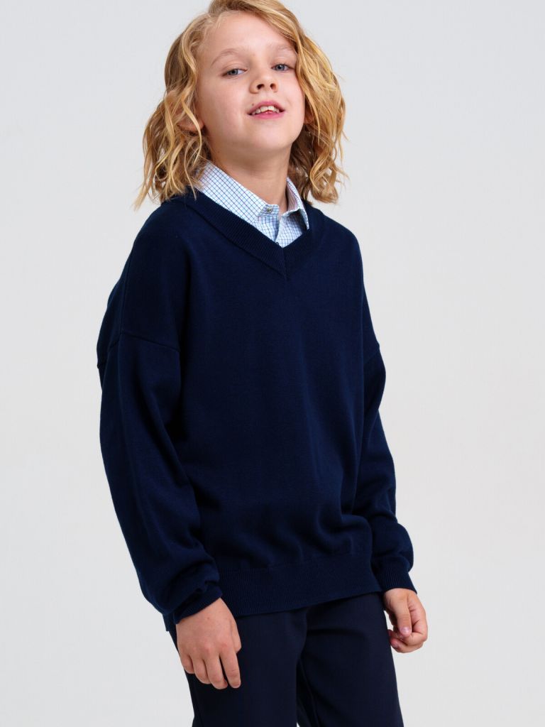 Оверсайз синий школьный джемпер для мальчика подростка. Джемпер выполнен из вязаного трикотажа с высоким содержанием хлопка. Кофта в школу выглядит стильно, благодаря лаконичному дизайну. Рубашка, футболка или поло + джемпер для школьника составят красивый элегантный комплект для школы.