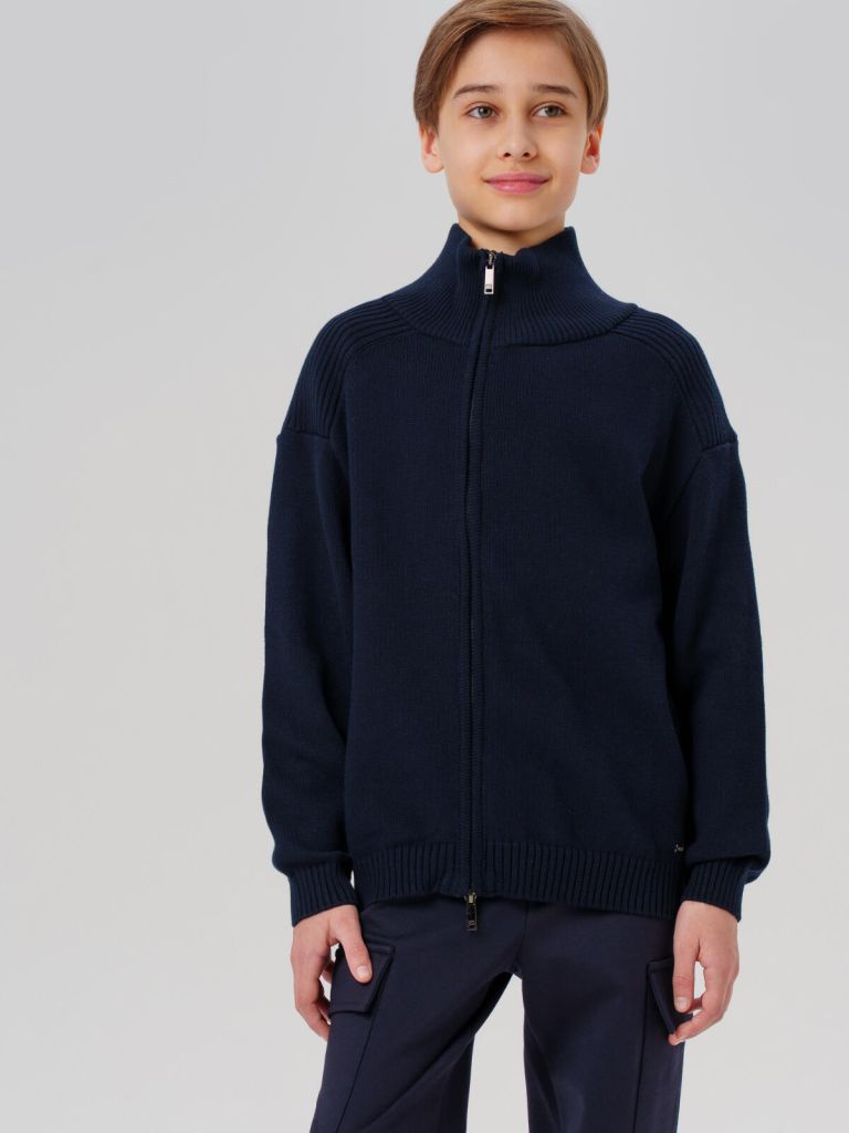 Классический тёмно-синий школьный вязаный кардиган оверсайз для мальчика подростка от PlayToday — универсальный элемент гардероба для юного школьника, который ценит комфорт и индивидуальность. Модель выполнена в модном оверсайз-силуэте: свободный крой не сковывает движения и отлично подходит для школы, прогулок и занятий.