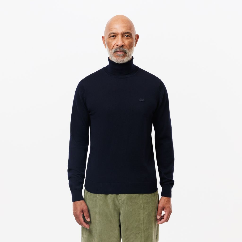 Джерси из мериносовой шерсти\Водолазка в рубчик\Эластичный воротник, манжеты и нижний край\Логотип на груди в тон изделия\Материал: 100% шерсть\Рост модели 186 см, \Размер одежды 4