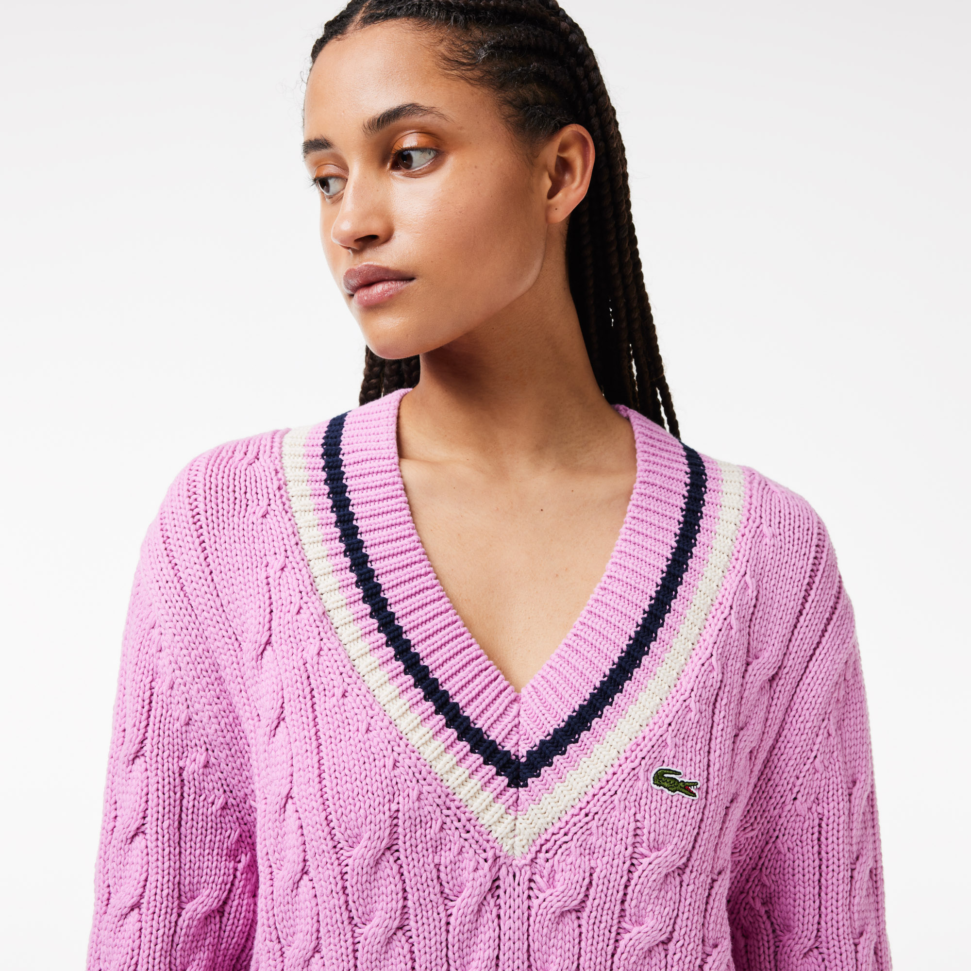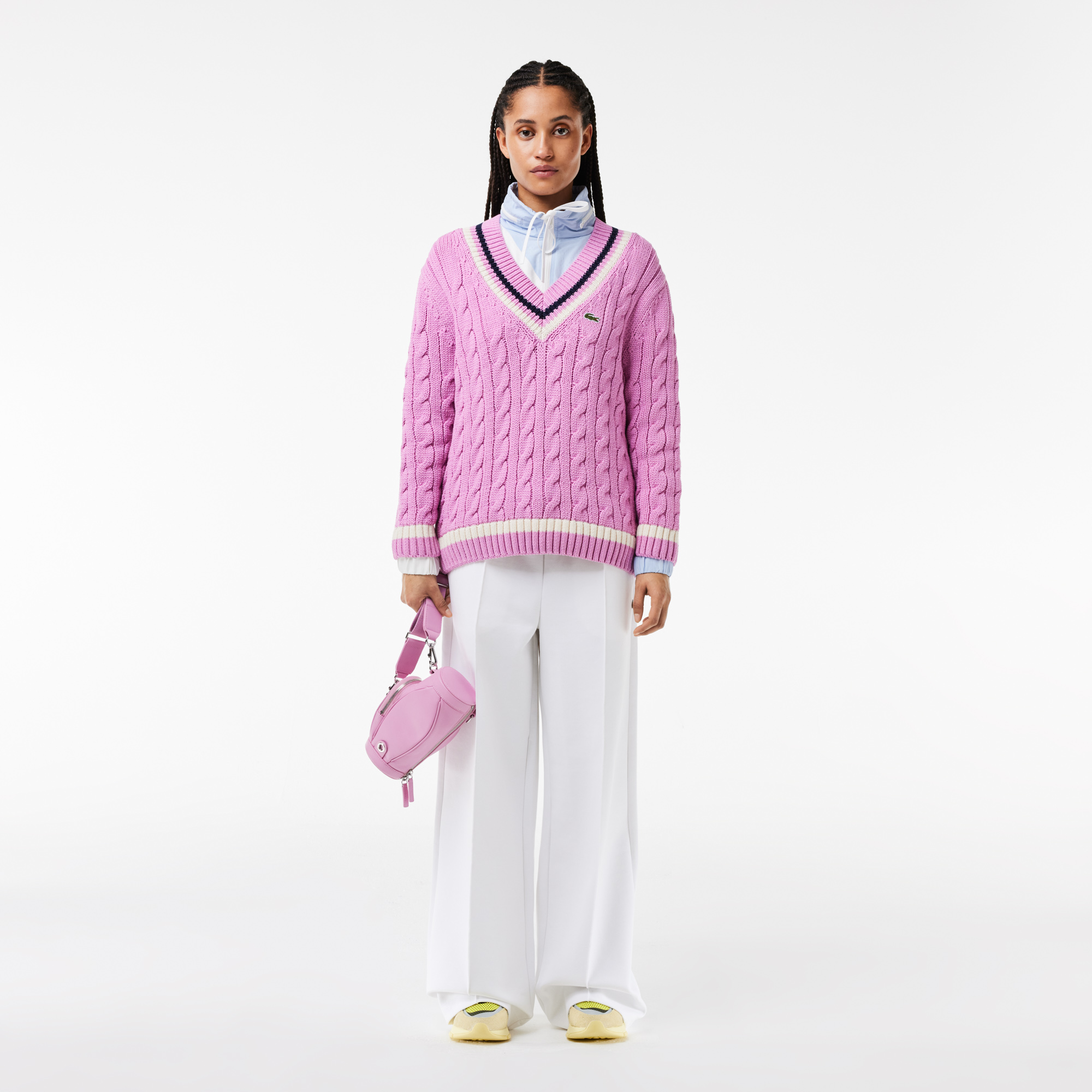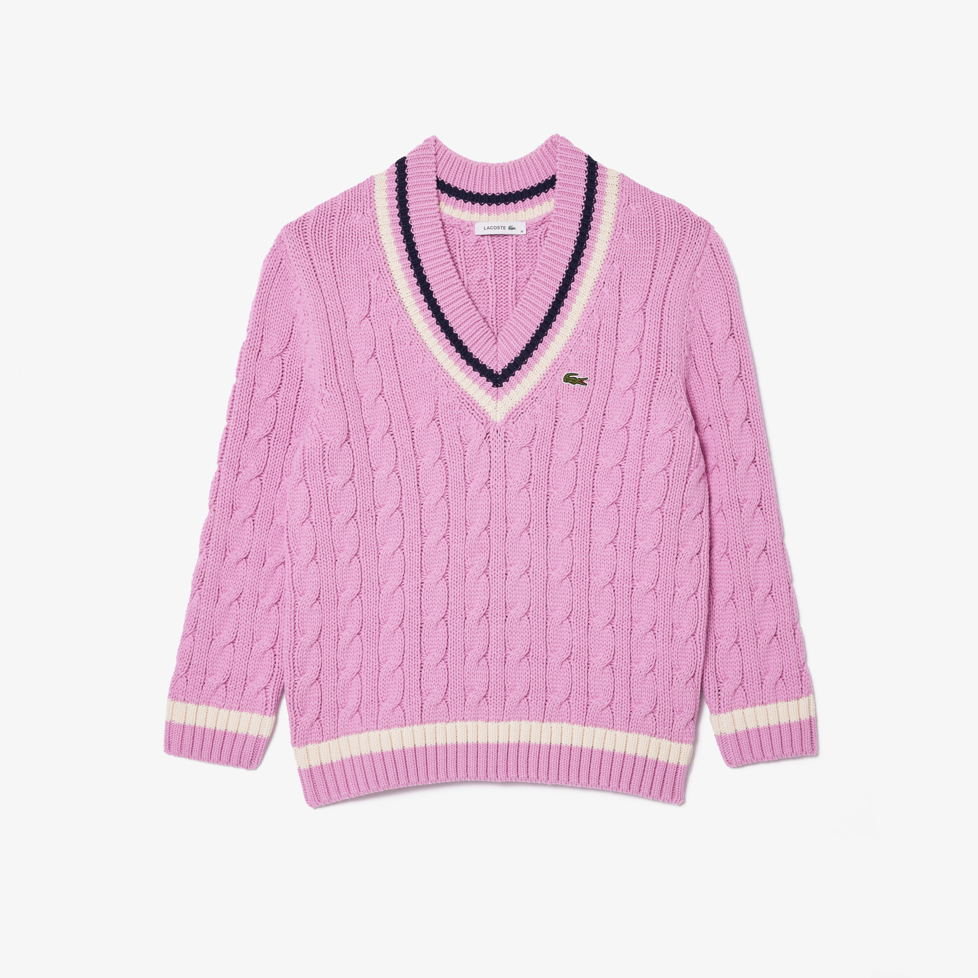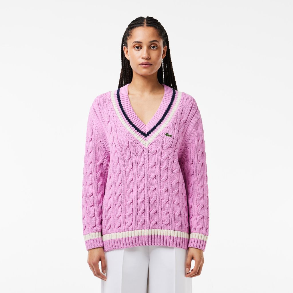 Хлопчатобумажный теннисный свитер с V-образным вырезом ручной вязки \ Органический хлопок \ Горловина в полоску \ Контрастная полоска по низу \ Вышитый логотип на груди \ V-образный воротник\Спущенная линия плеч\Контрастные полосы\Крупная вязка\Логотип н