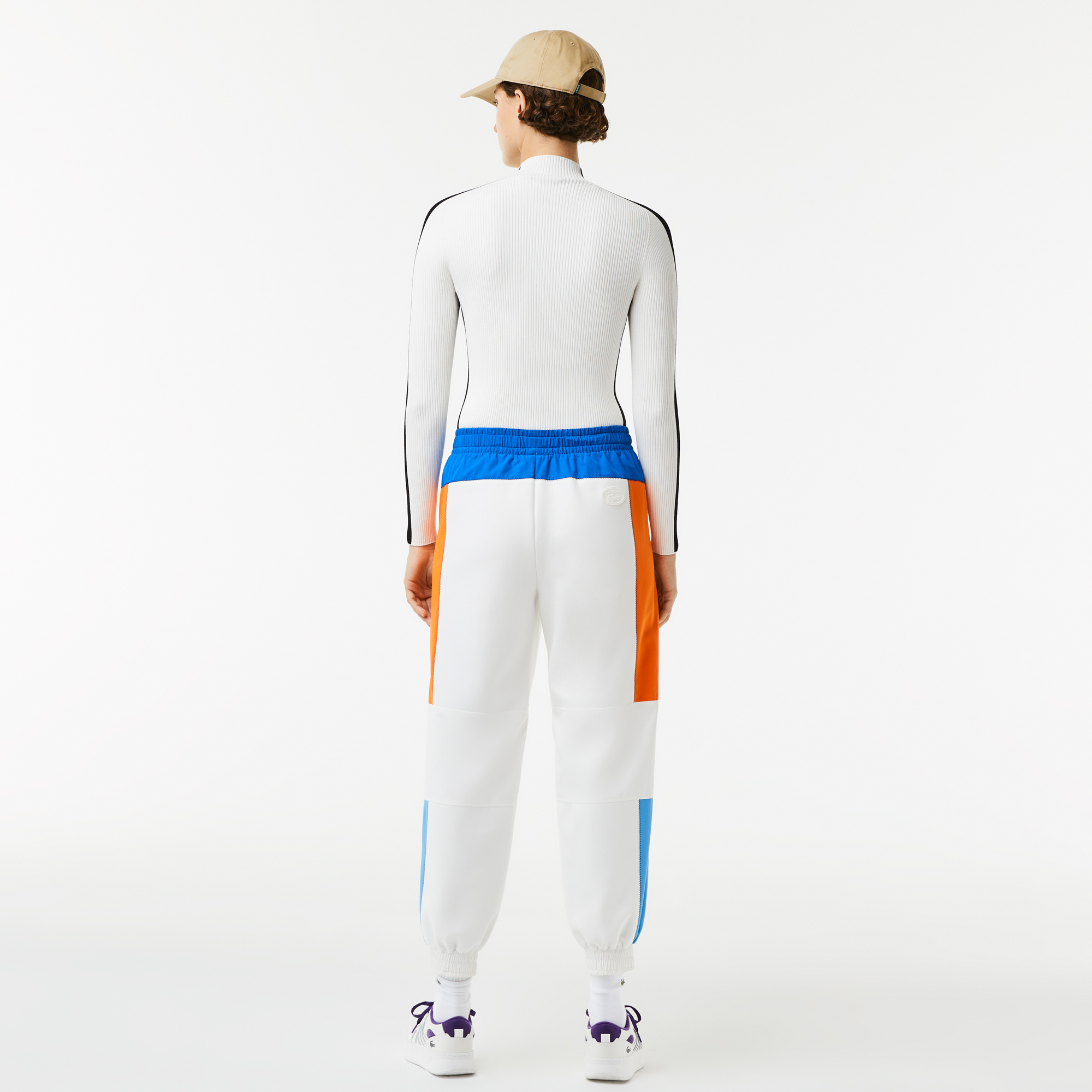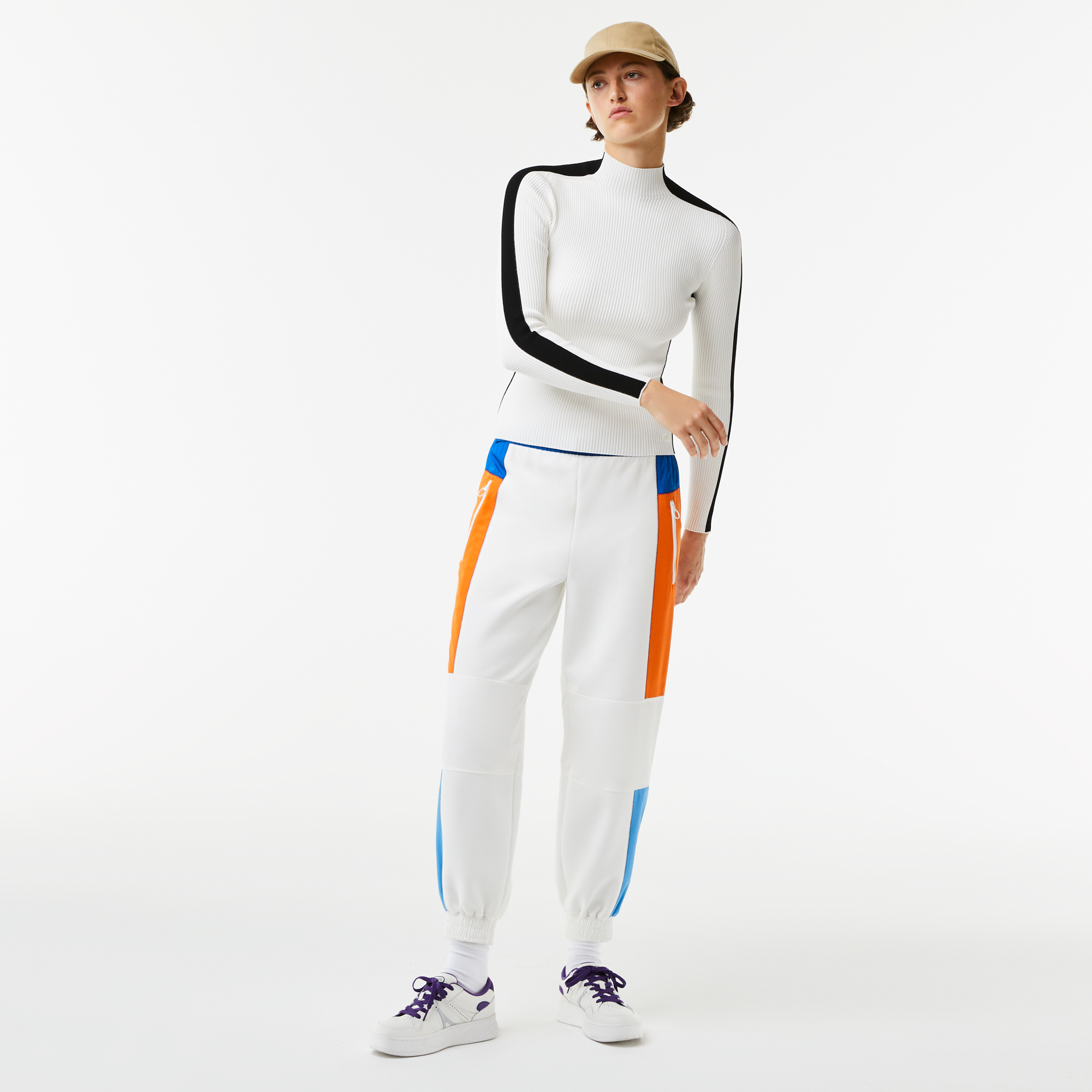 Женский бесшовный свитер с контрастными полосами Lacoste \ Воротник-стойка: \ Контрастные полосы на рукавах и по бокам: \ Низ с вышивкой в виде крокодила: \ Бесшовный вискозный трикотаж в рубчик: \ Материал: 92% полиамид 8% эластан\Данный товар возврату