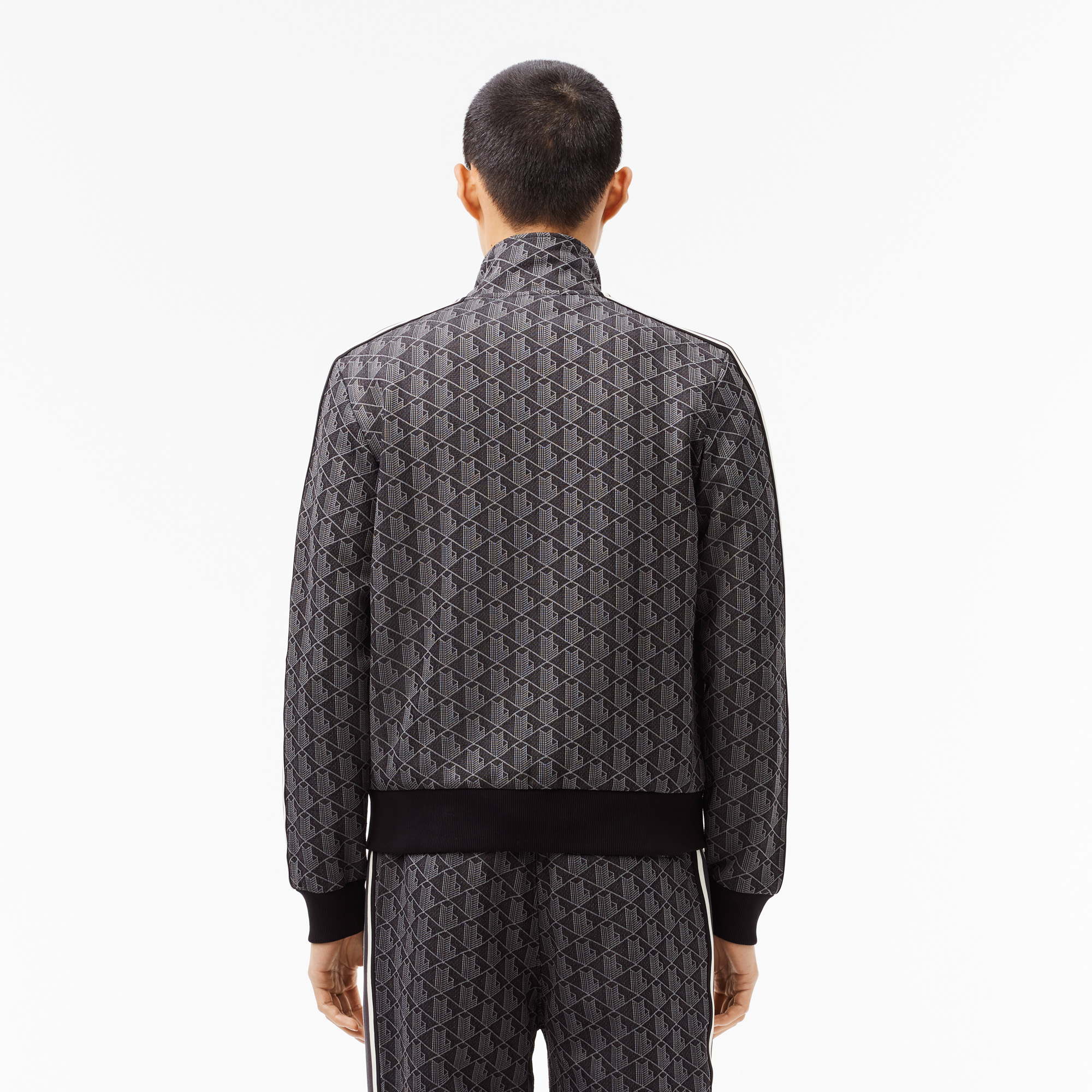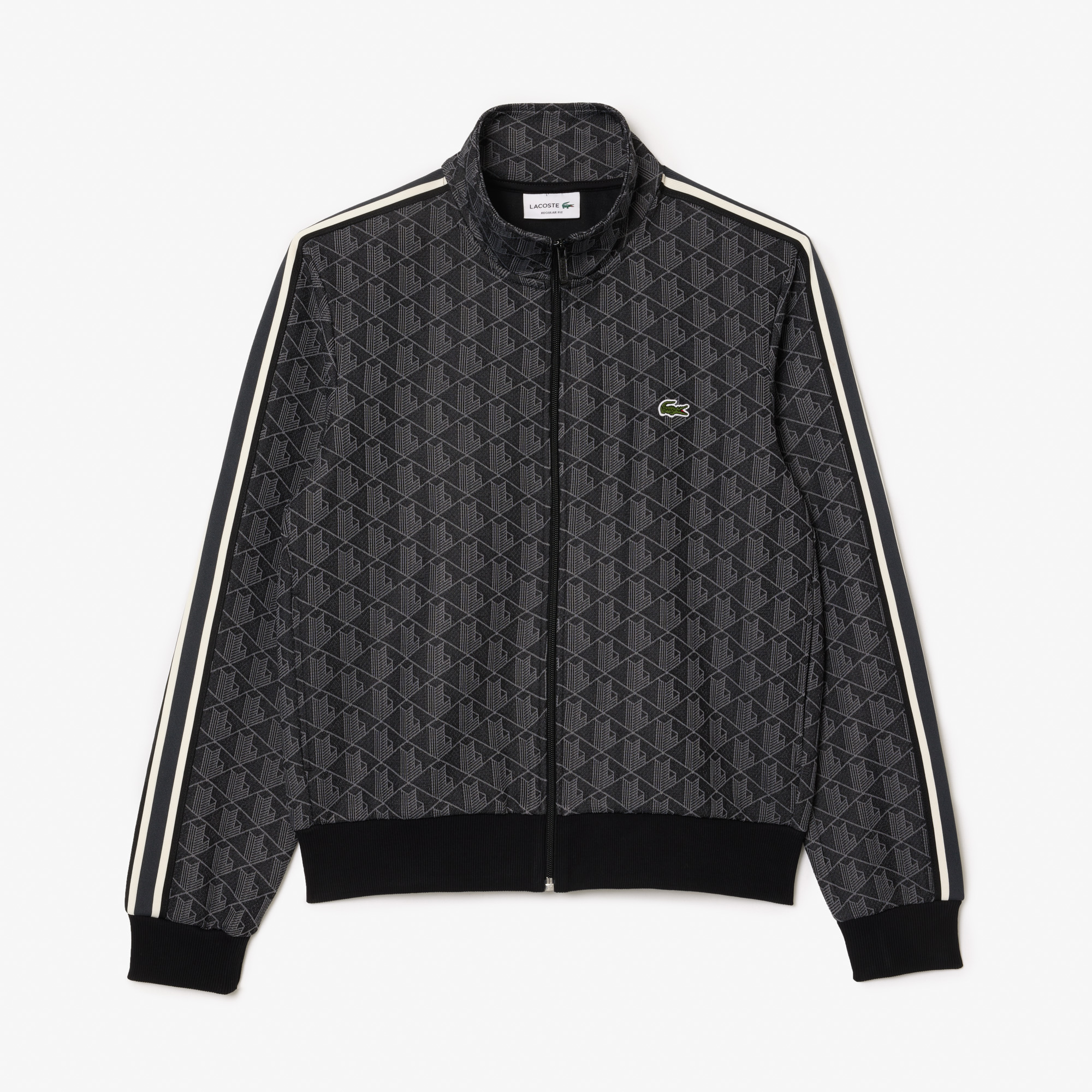 Жаккардовая трикотажная ткань из органического хлопка и переработанного полиэстера\обычный, слегка приталенный крой\два прорезных кармана по бокам\на молнии\воротник-стойка\монограмма по всему изделию\эластичные манжеты и нижний край\контрастные полосы на