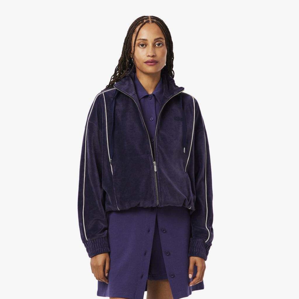 Велюровая толстовка Oversize на молнии \ Хлопковый велюр \ Oversize-крой, заниженные плечи \ Контрастная отделка по торсу и рукавам \ Регулируемый высокий вырез с завязками в тон \ Два боковых кармана \ Вышитая в тонЛоготип крокодила на груди \ Oversize-