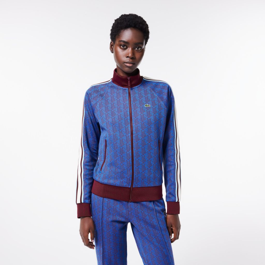 Жаккардовая ткань\Высокий воротник\Контрастные полосы\Рукава реглан\Монограмма по всему изделию\На молнии\Прорезные карманы на молнии\Логотип на груди\Материал: 59% полиэстер 38% хлопок 3% полиамид\Рост модели 177 см, размер одежды 36