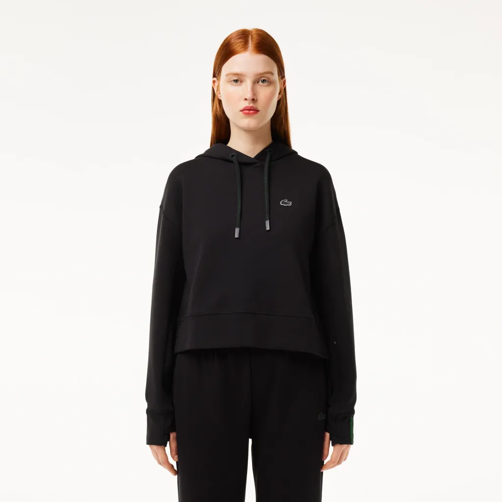 Короткая хлопковая толстовка с капюшоном \ Двусторонняя эластичная ткань из смесового хлопка \ Свободный, удобный крой с прямыми рукавами \ Петли для большого пальца на манжетах