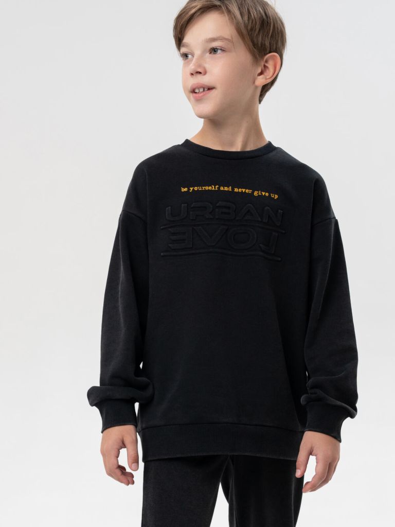 Чёрная подростковая толстовка оверсайз для мальчика от PlayToday — стильный свитшот, который станет базой школьного и повседневного гардероба. Модель выполнена из мягкого футера без начёса, который дышит, приятен к телу и обеспечивает комфорт при ежедневной носке. Современный прямой крой и актуальный камуфляжный принт с надписью делают толстовку яркой и модной деталью образа.