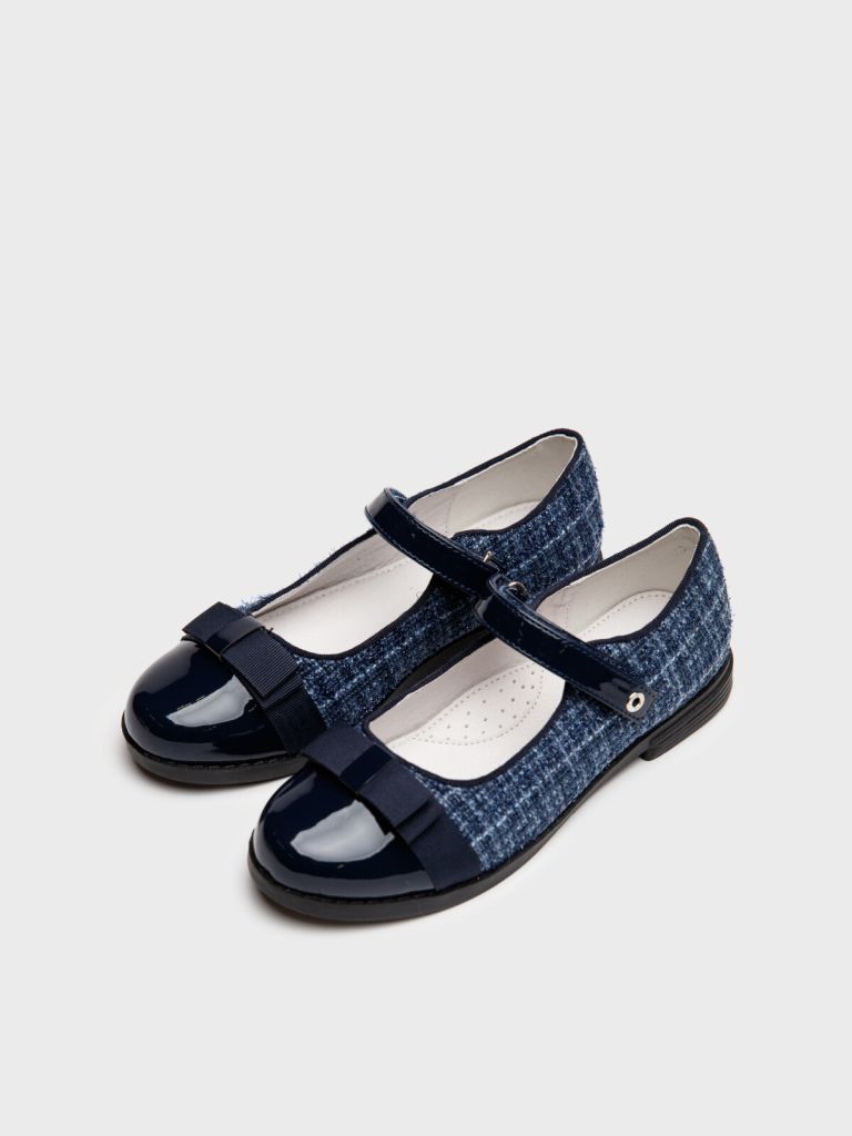 Эти нарядные подростковые туфли для школы выполнены из твидовой ткани с лёгким блеском — она придаёт образу изысканность, оставаясь в рамках школьного дресс-кода. Лаковые детали и аккуратный бант делают модель особенно привлекательной.