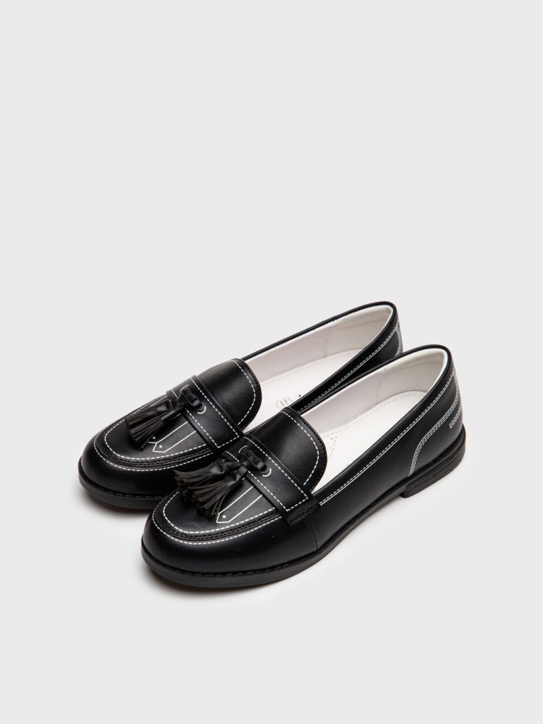 Модные туфли-лоферы для девочки подростка. Школьные лоферы выполнены из искусственной кожи и имеют трендовый "фейк" принт деталей и строчек. Подкладка - 100% натуральная кожа. Кожаная стелька с анатомическим элементом обеспечивает правильную нагрузку на стопу школьницы. Формоустойчивый задник поддерживает стопу в правильном положении. Подошва легкая и гибкая. Туфли-лоферы отлично подойдут как сменка в школу и для прогулок: весна, осень.