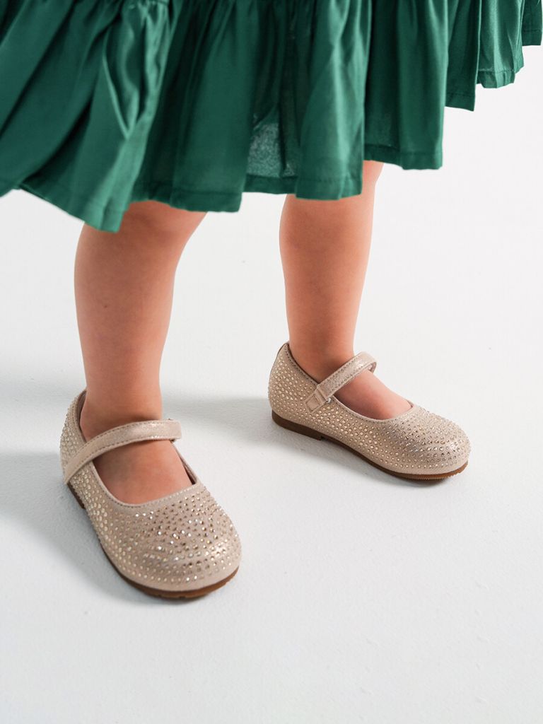 Нарядные туфли из текстиля, усыпанного искрящимися стразами. Подкладка выполнена из натуральной кожи. Стелька выполнена из натуральной кожи и имеет анатомический элемент для поддержания свода стопы. Удобная колодка. Подошва из терморезины очень гибкая. Для удобства обувания предусмотрен ремешок с липучкой. В пяточной части для комфорта предусмотрен мягкий кант.