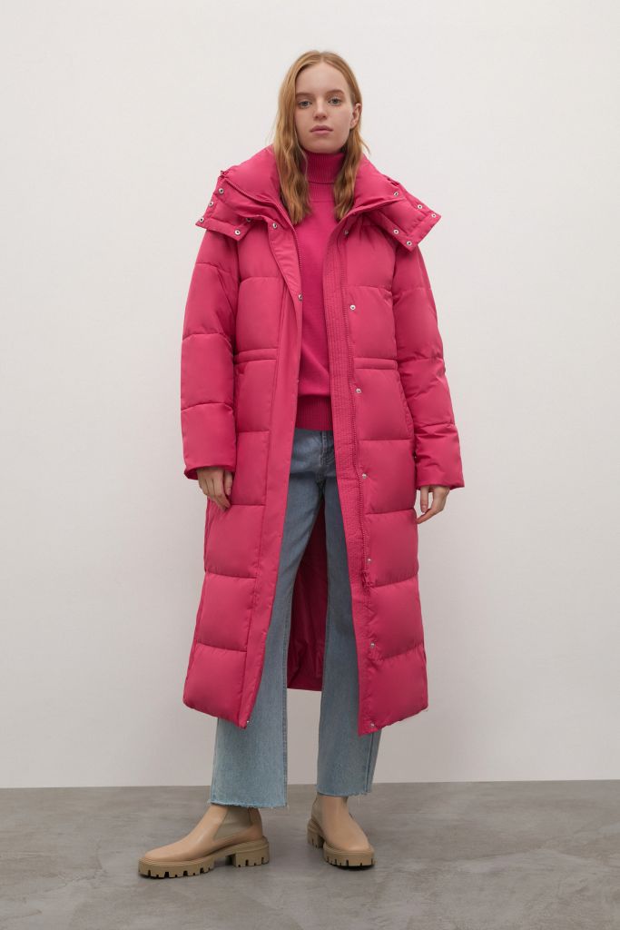 Утепленное пальто с капюшоном и воротником-стойкой