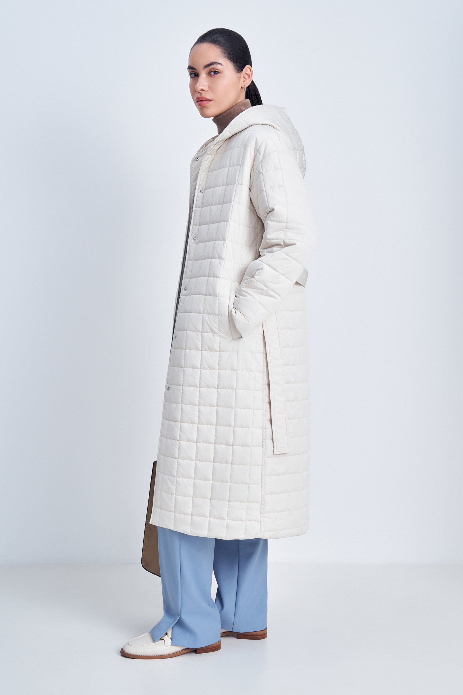 Утепленное пальто с капюшоном и воротником-стойкой