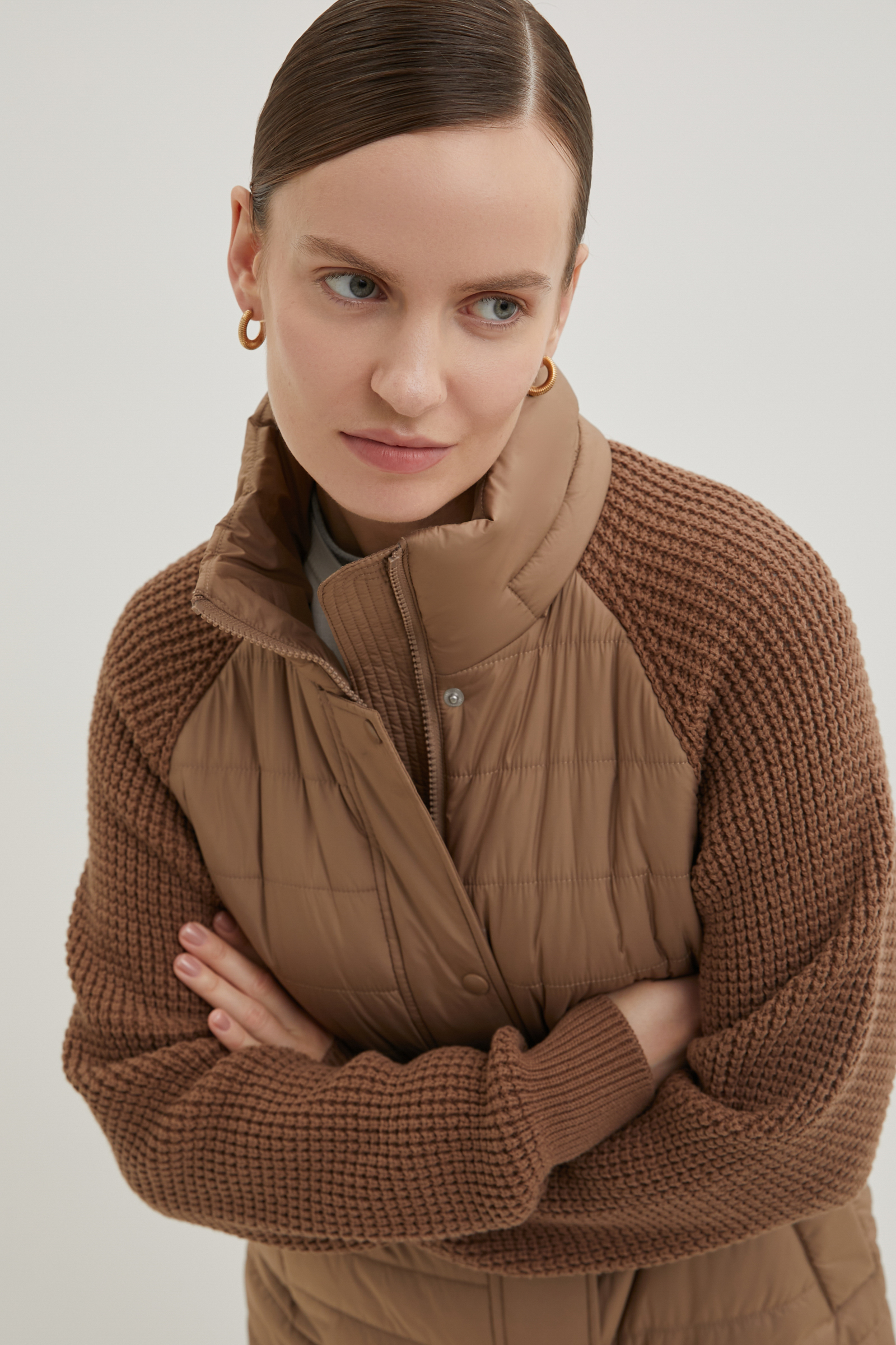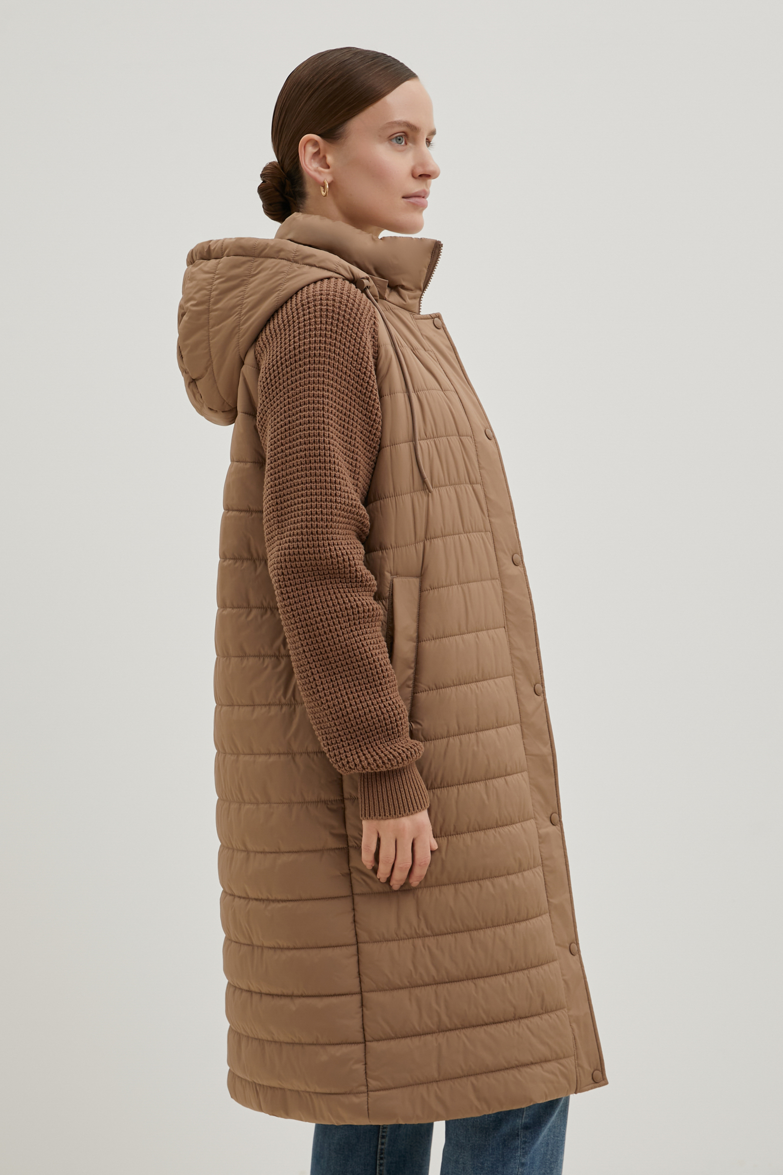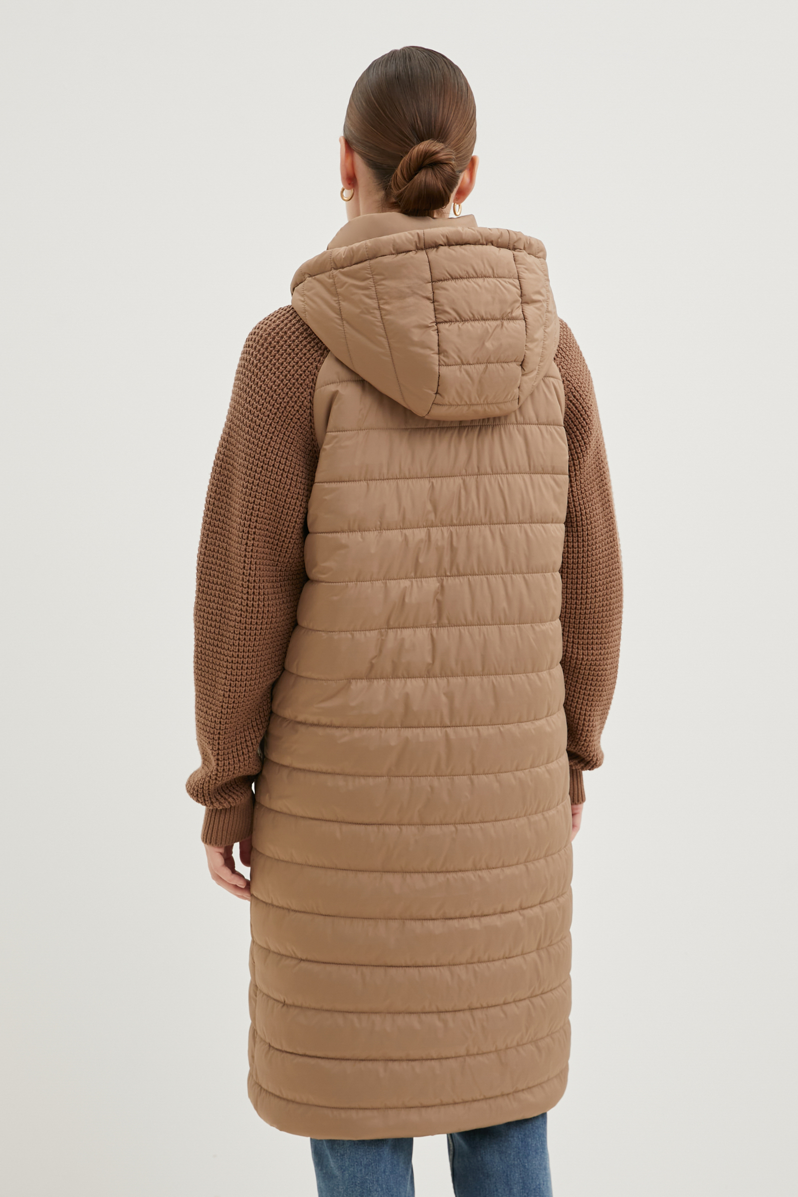 Утепленное полупальто с вязаными рукавами