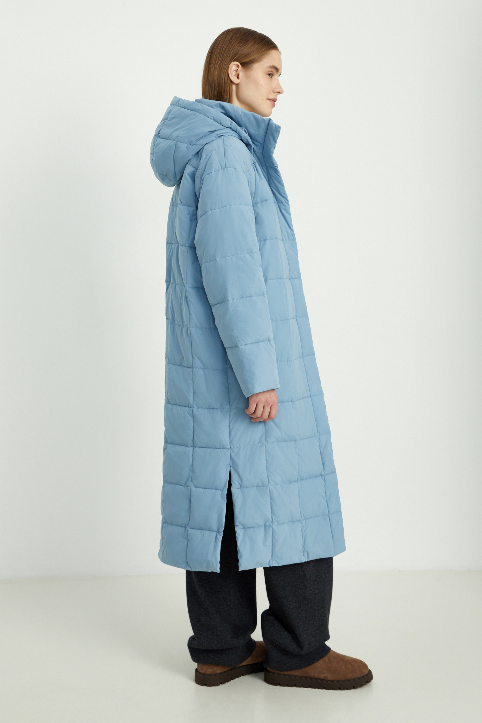 Утепленное пальто с капюшоном и воротником-стойкой