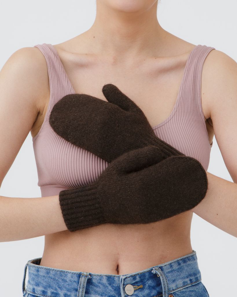 Темно-коричневый цвет варежек добавляет образу утонченности и универсальности, позволяя легко сочетать их с различными стилями верхней одежды. Варежки выполнены в классическом дизайне с высокой манжетой, что обеспечивает надежную фиксацию и дополнительное тепло.