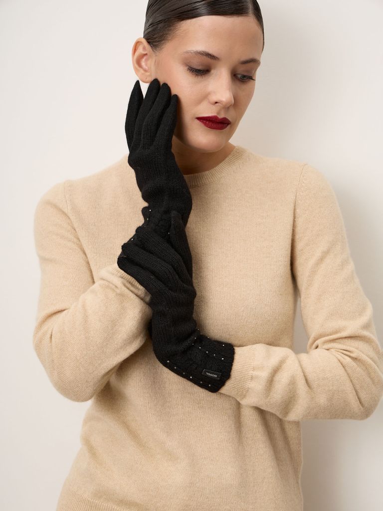 Элегантные женские перчатки из 100% монгольского кашемира в чёрном цвете — мягкие, тёплые и гипоаллергенные. Декоративная фактурная вязка со стразами подчеркивает премиальность модели. Универсальный размер подходит большинству, обеспечивая комфорт и нежное тепло в холодное время года.