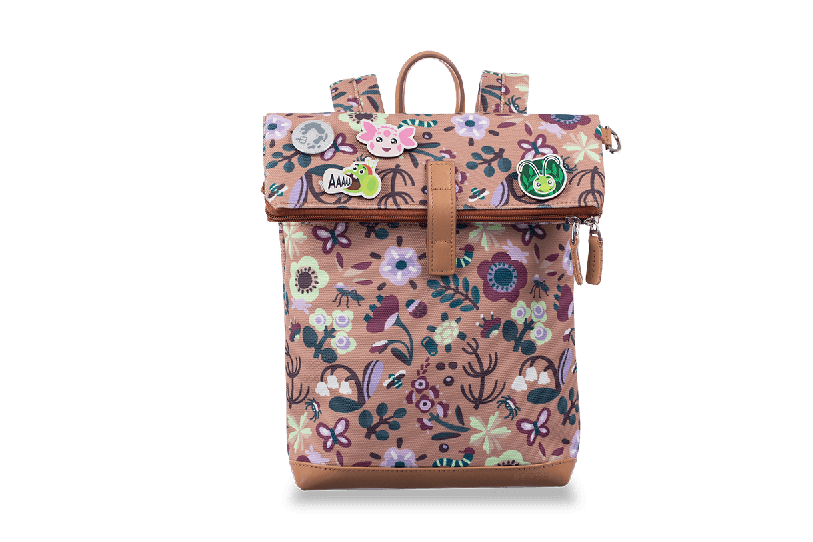 Детский рюкзак роллтоп выполнен из плотного канваса с принтом «цветы» и натуральной гладкой кожи.
