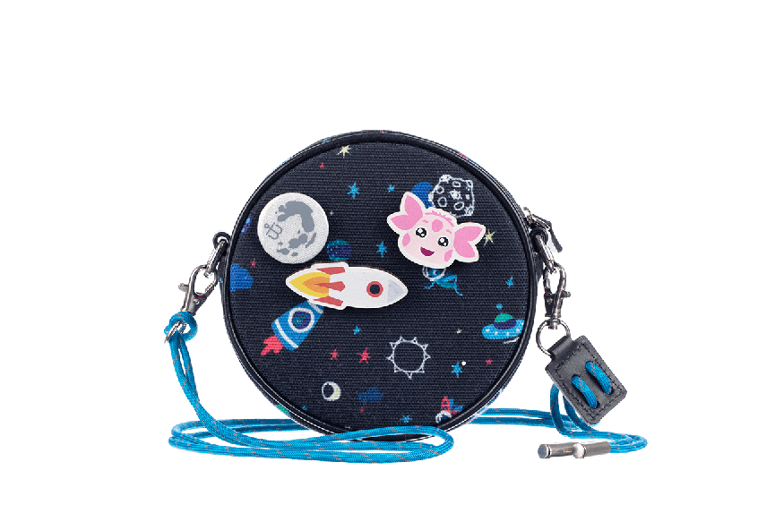 Компактная сумка-круг выполнена из плотного канваса с принтом «космос» и натуральной гладкой кожи.