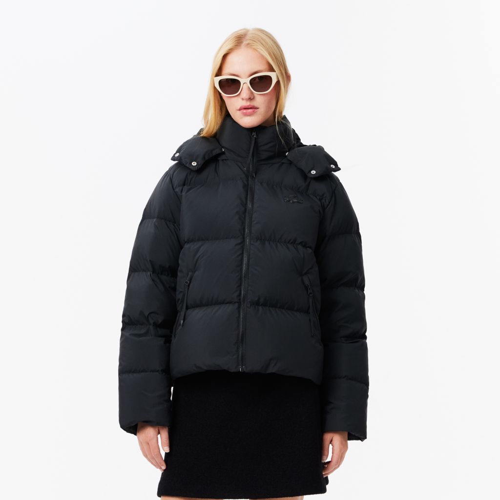 Пуховик с капюшоном свободного покроя \ Переработанная полиамидная тафта, ограничивающая использование сырья \ Наполнитель из утиного пуха \ Завязки на талии и капюшоне \ Глянцевый рельефный крокодил на груди \ Изделие большого размера. Мы советуем вам бр...