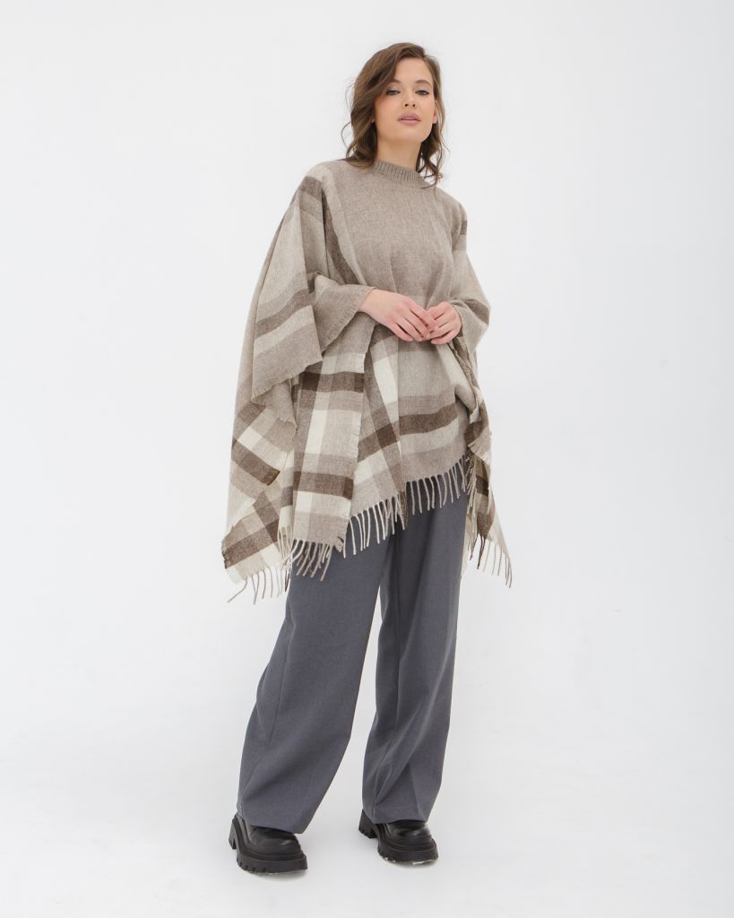 Джемпер-пончо из шерсти UL KL — уютная и стильная модель свободного силуэта, которая сочетает комфорт и выразительный дизайн. Идеально подходит для многослойных образов в прохладное время года.Материал:Натуральная шерсть, мягкая, тёплая и дышащая, обеспечивает комфорт при носке и хорошо сохраняет тепло.Цвет:Натуральная бежево-коричневая гамма с клетчатым узором, легко сочетается с базовым гардеробом.Дизайн:Формат пончо с широким кроем, декоративная клетка и аккуратная бахрома по краю создают эффектный и современный образ.Силуэт:Свободный, не сковывает движений, подходит для разных типов фигур.Длина:Удлинённая, закрывает линию бёдер.Особенности:Удобен для многослойных образов, можно носить поверх джемперов, водолазок и рубашек.Сезон:Осень, зима, прохладная весна.Уход:Рекомендуется деликатная ручная стирка или химчистка, сушка в разложенном виде.Готовую памятку по уходу вы можете прочитать у нас в блоге.