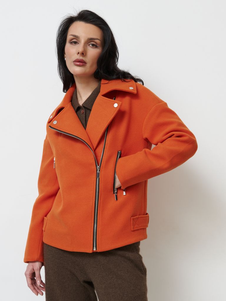 Женское пальто в стиле косухи выполнено в выразительном апельсиновом оттенке, который добавляет образу яркий акцент. Модель сочетает современный крой и элегантную лаконичность, подчёркивая индивидуальность и уверенность.
