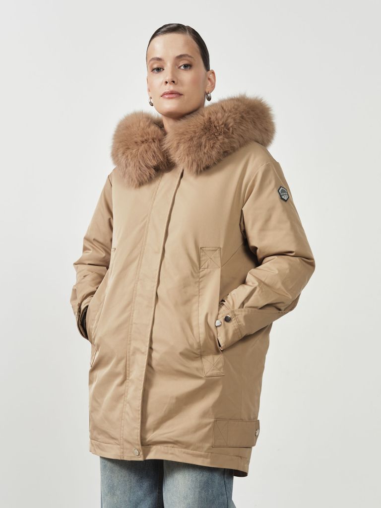 Капюшон с объёмной натуральной меховой отделкой, создающей дополнительную защиту от холода и стильный акцент.