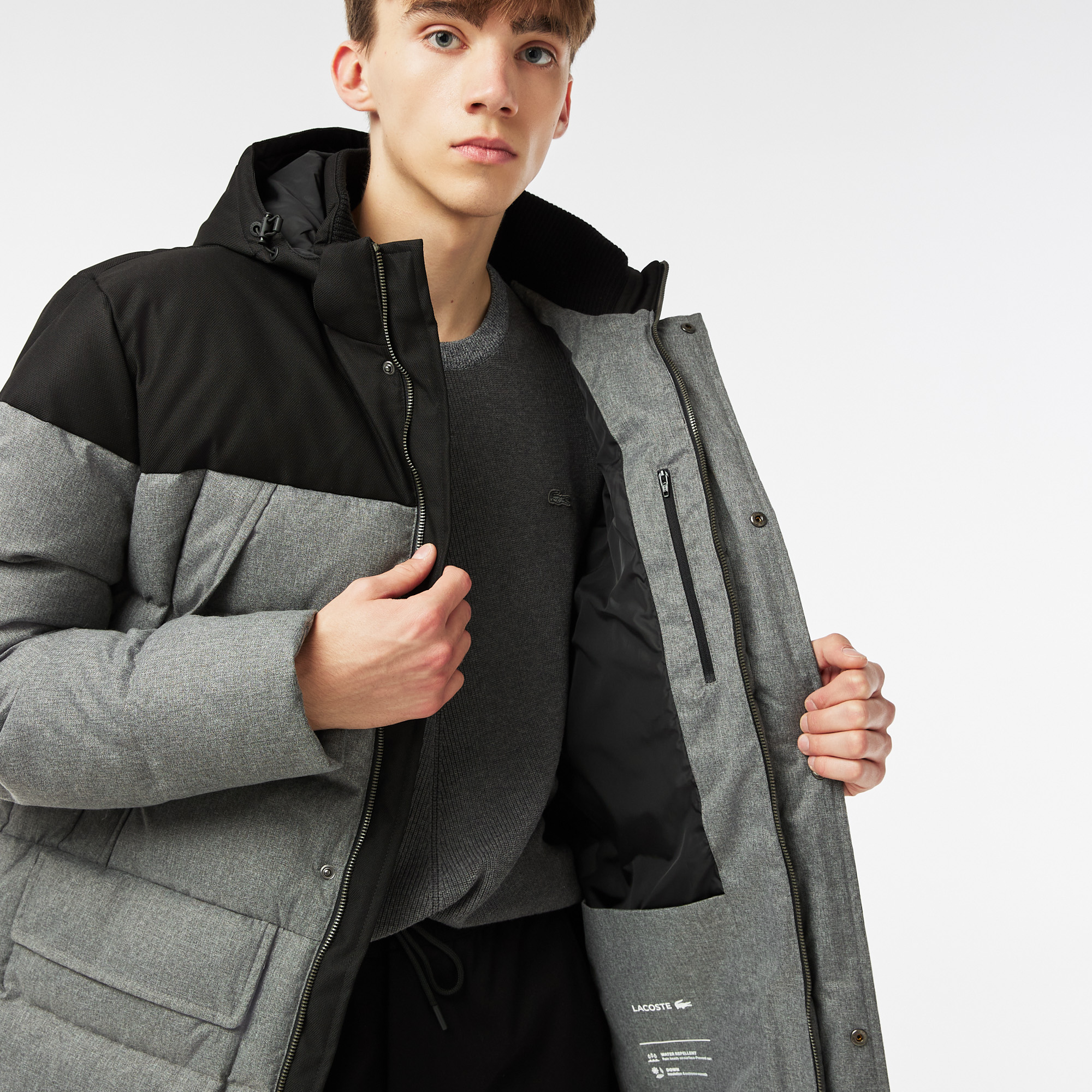 С капюшоном\Утеплитель пух-перо\Прорезные карманы на молнии\Карманы с клапаном\На молнии и на кнопках\Потайной карман внутри\Логотип на груди\Материал: 100% полиэстер, 90% пух 10% перо
