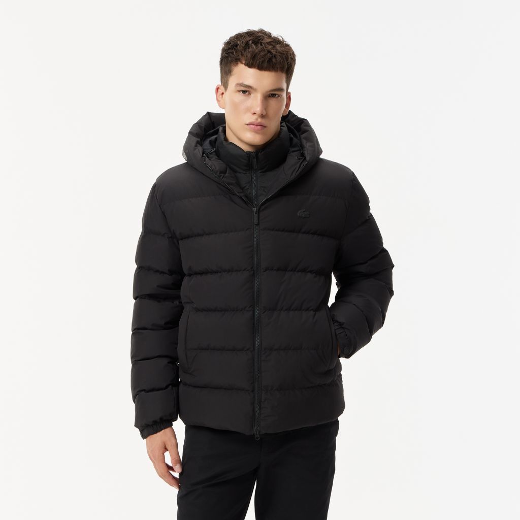 Классический крой \ Комбинированная внешняя ткань \ Съёмный капюшон \ Карманы на молнии \ Лого на груди тон в тон Материал: 100% полиэстер \ Наполнитель: Пух 90% Перо 10%