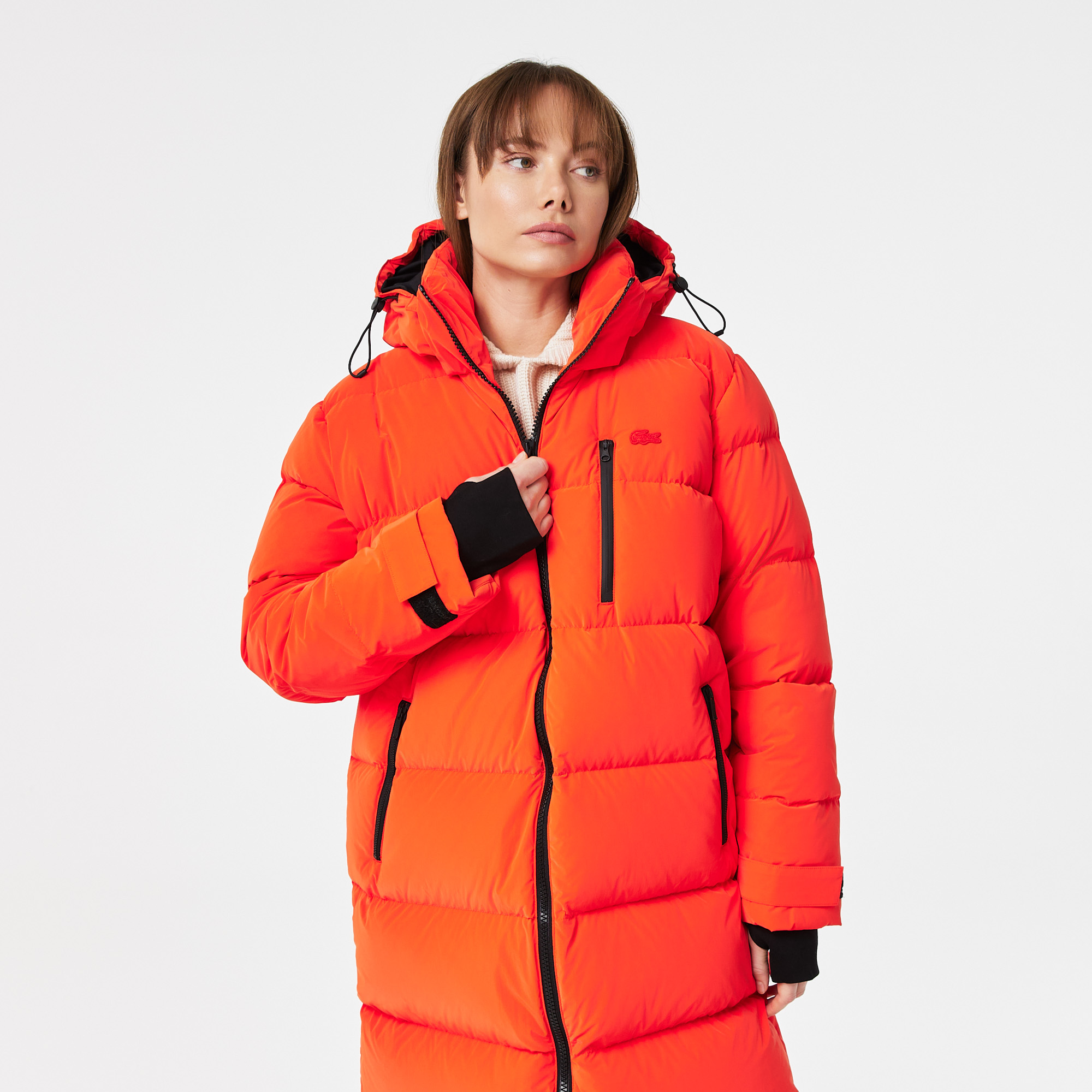 Удлиненный пуховик\Капюшон отстегивается\Дополнительные эластичные манжеты с прорезью для большего пальца\Прорезной карман на молнии на груди\Прорезные карманы на молнии сбоку\Потайной карман внутри\Брэндинг на спине\Логотип в тон изделия на груди\Материа