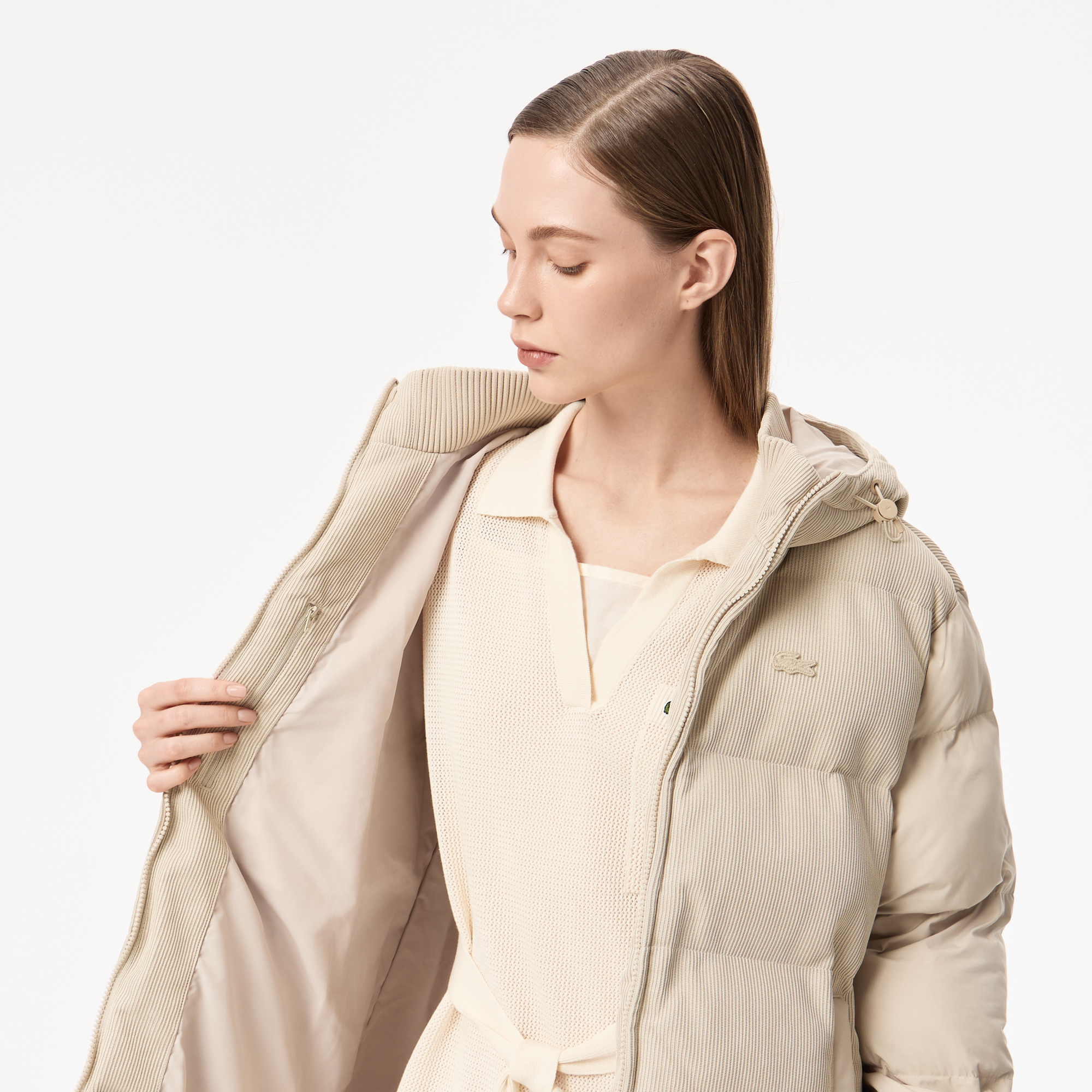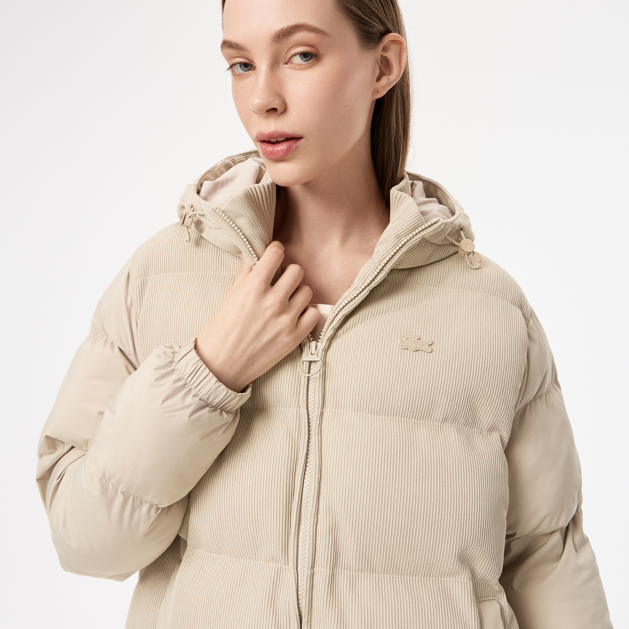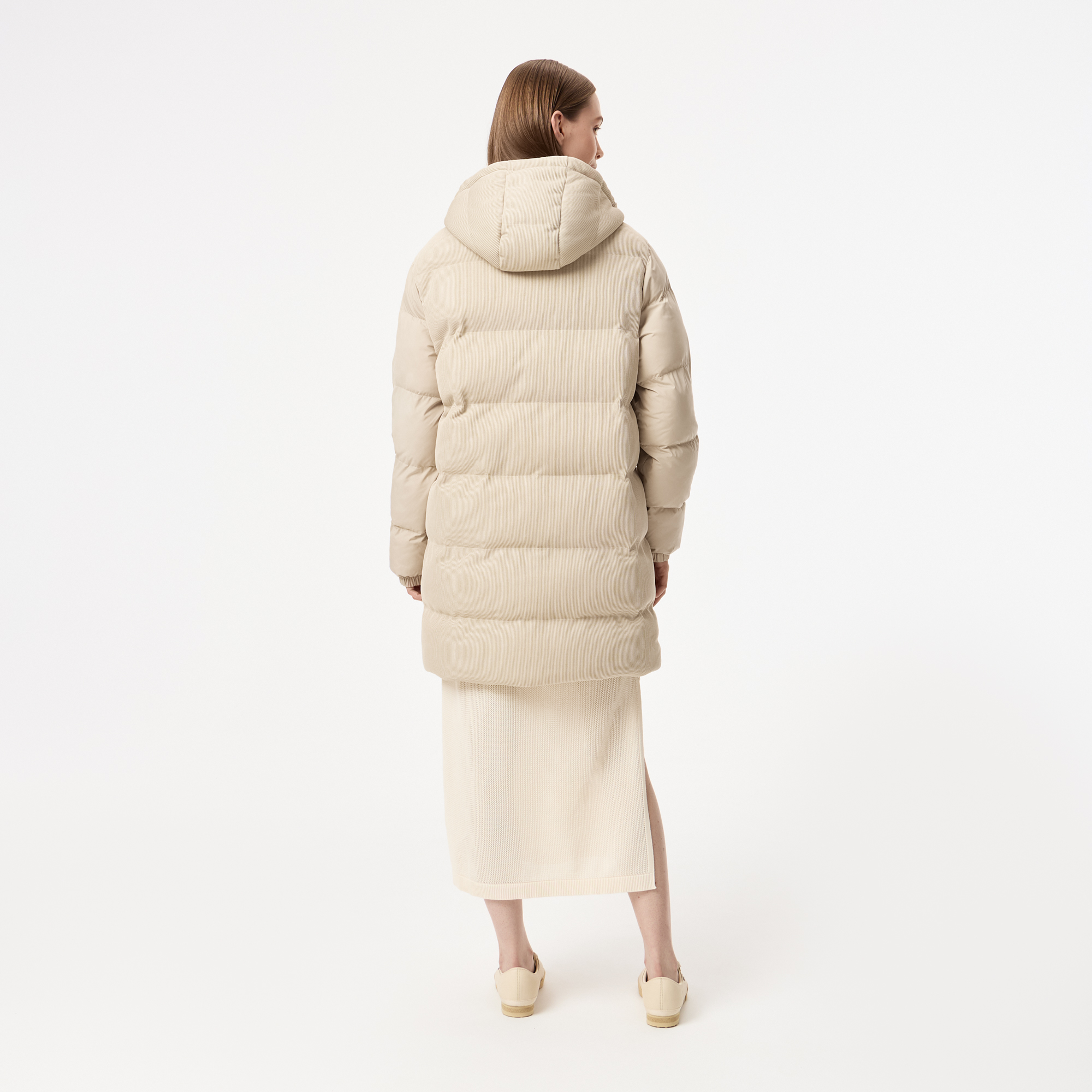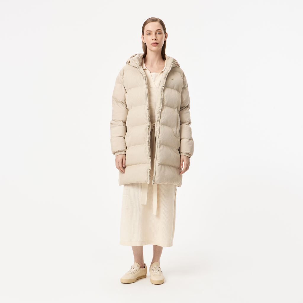 Длина чуть выше колен \ Вельветовая ребристая стурктура \ Высокий ворот \ Регулировка карюшона \ Внутренние карманы на молнии \ Два передних боковых кармана \ Материал: 100% полиэстер