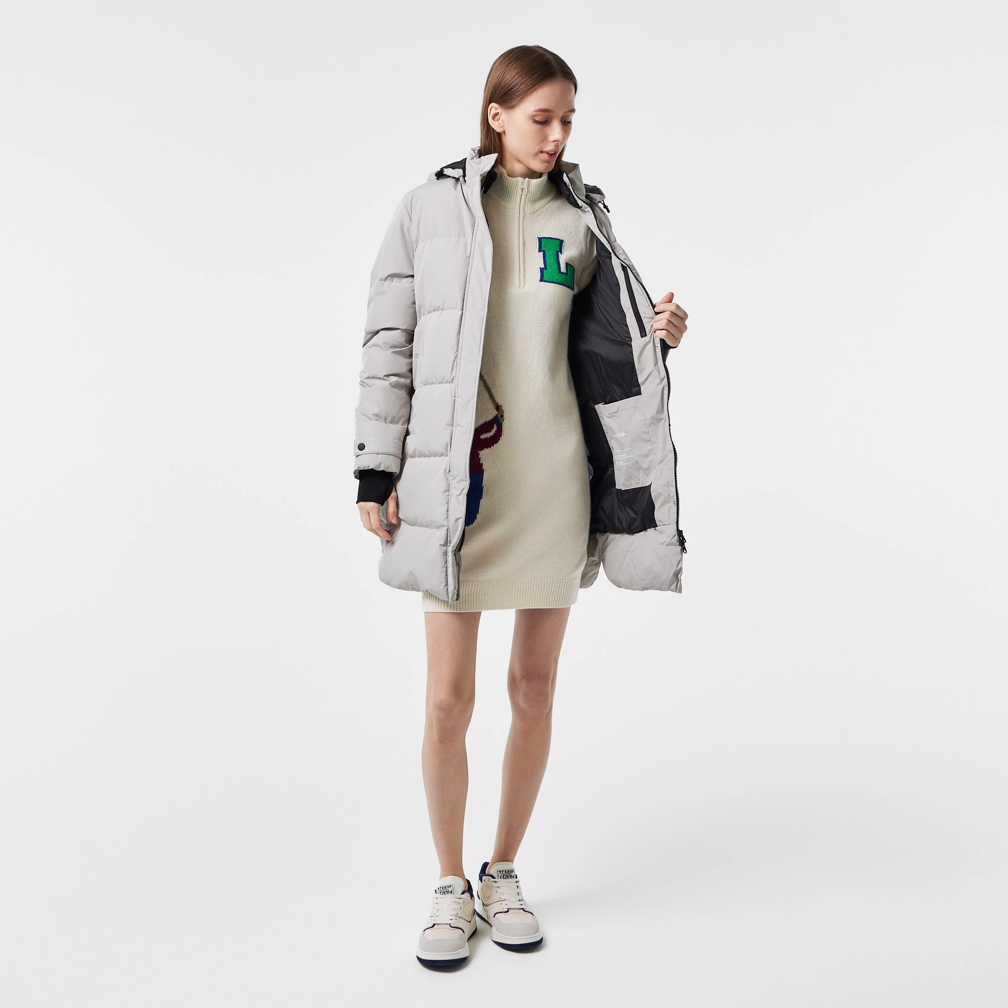 Regular Fit \Удлинённый\ Стеганый\ С отстёгивающимся капюшоном \ Логотип крокодила в тон на груди и контрастный на рукаве\ Удлинённые манжеты \ Материал: 100% полиэстер \ наполнитель пух 90%, перо 10%