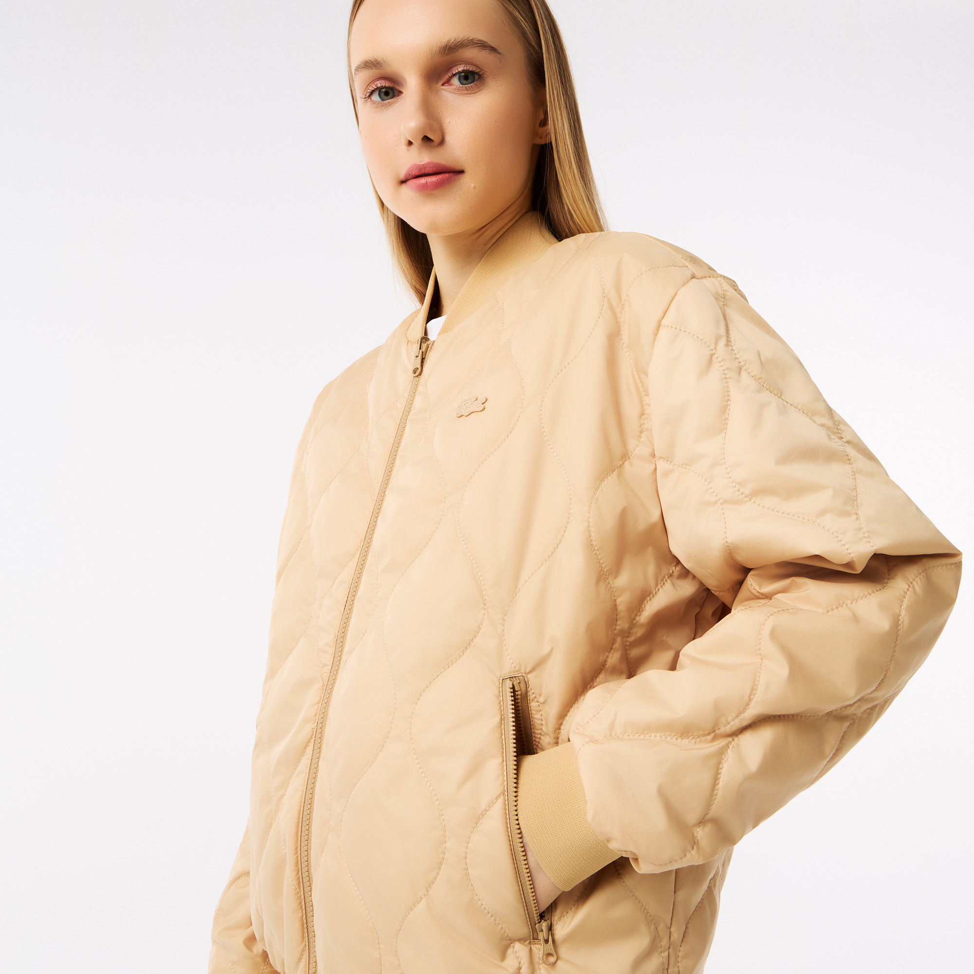 Двусторонний стёганный бомбер\ Эластичные манжеты\ Ребристый ворот, манжеты, подол \ 2 кармана на молнии \ Вторая сторона украшена монограммой\Материал: 100 % полиэстер. \ Размер на модели S