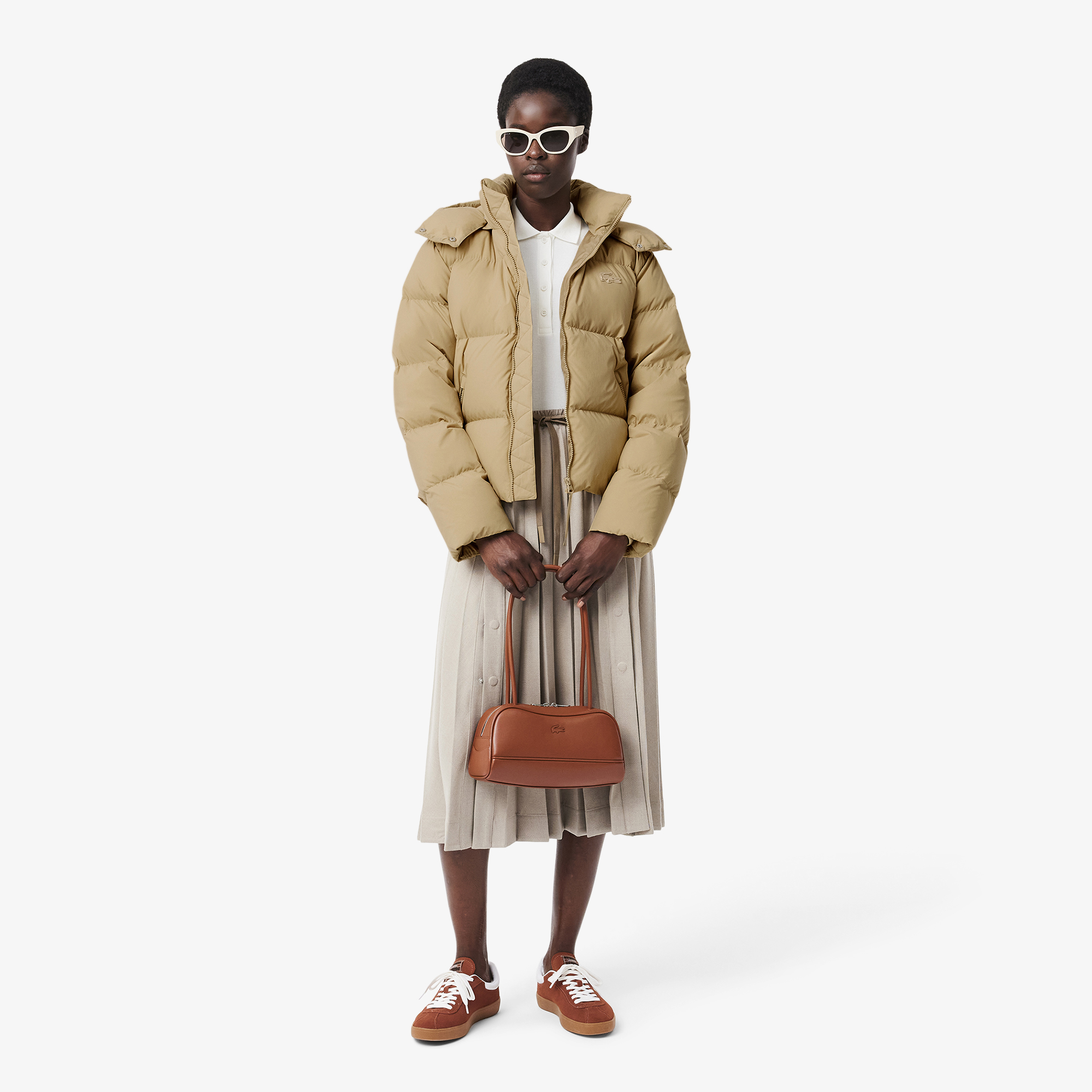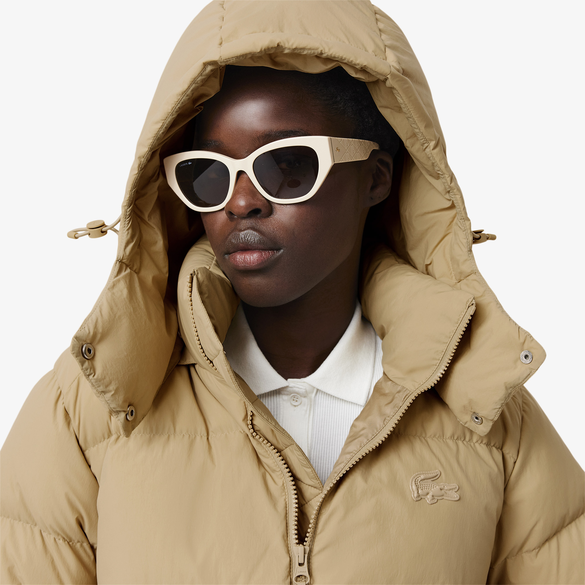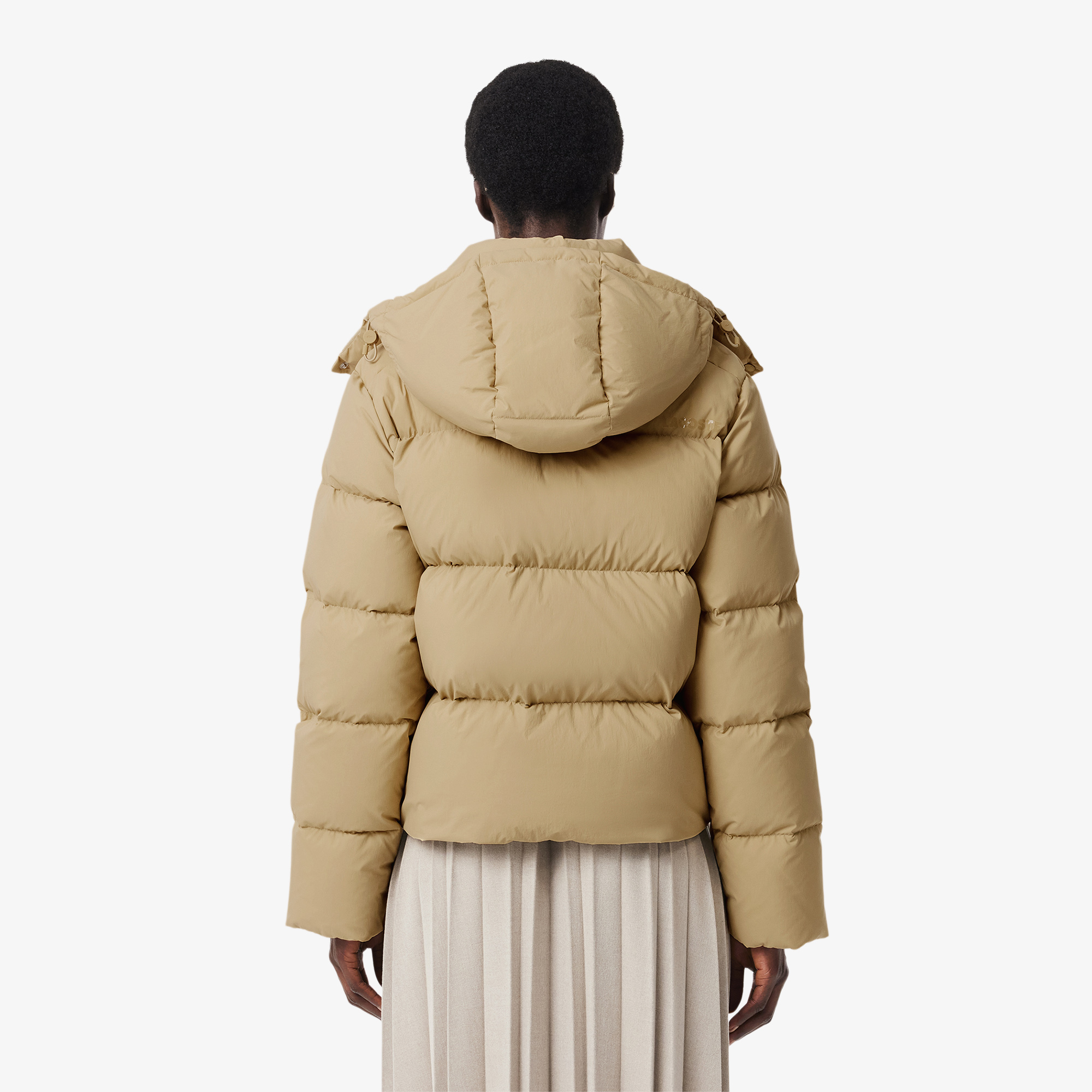 Пуховик с капюшоном свободного покроя \ Переработанная полиамидная тафта, ограничивающая использование сырья \ Наполнитель из утиного пуха \ Завязки на талии и капюшоне \ Глянцевый рельефный крокодил на груди \ Изделие большого размера. Мы советуем вам бр