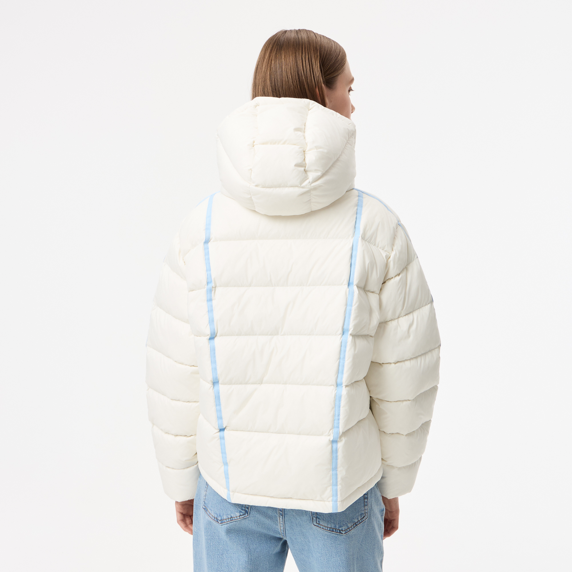 Стёганный пуховик \ Контрасные полосы на рукавах и спине \ Контрастная подкладка \ Двойная молния \ Ребристые манжеты \ Большие карманы \ Материал: 100% полиамид