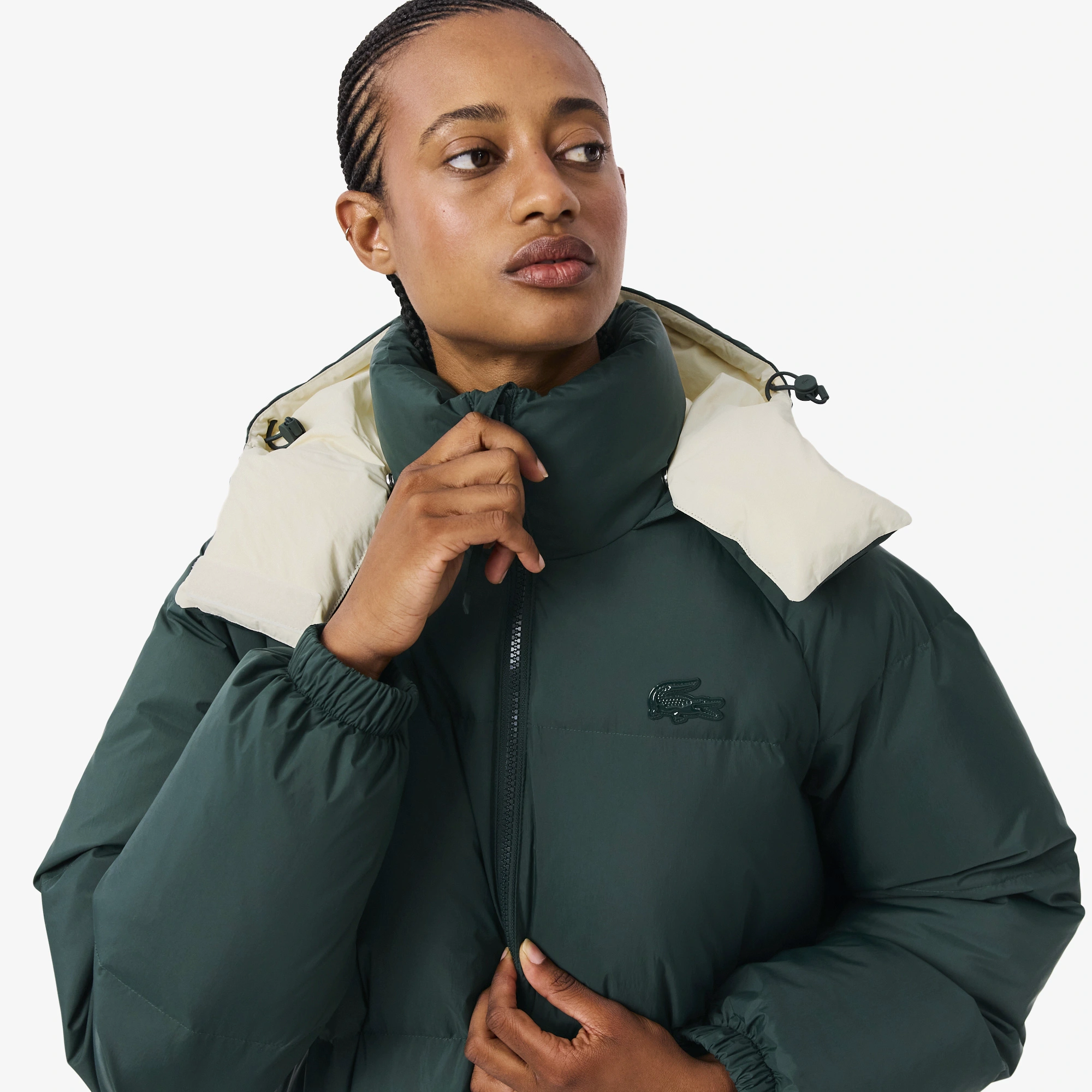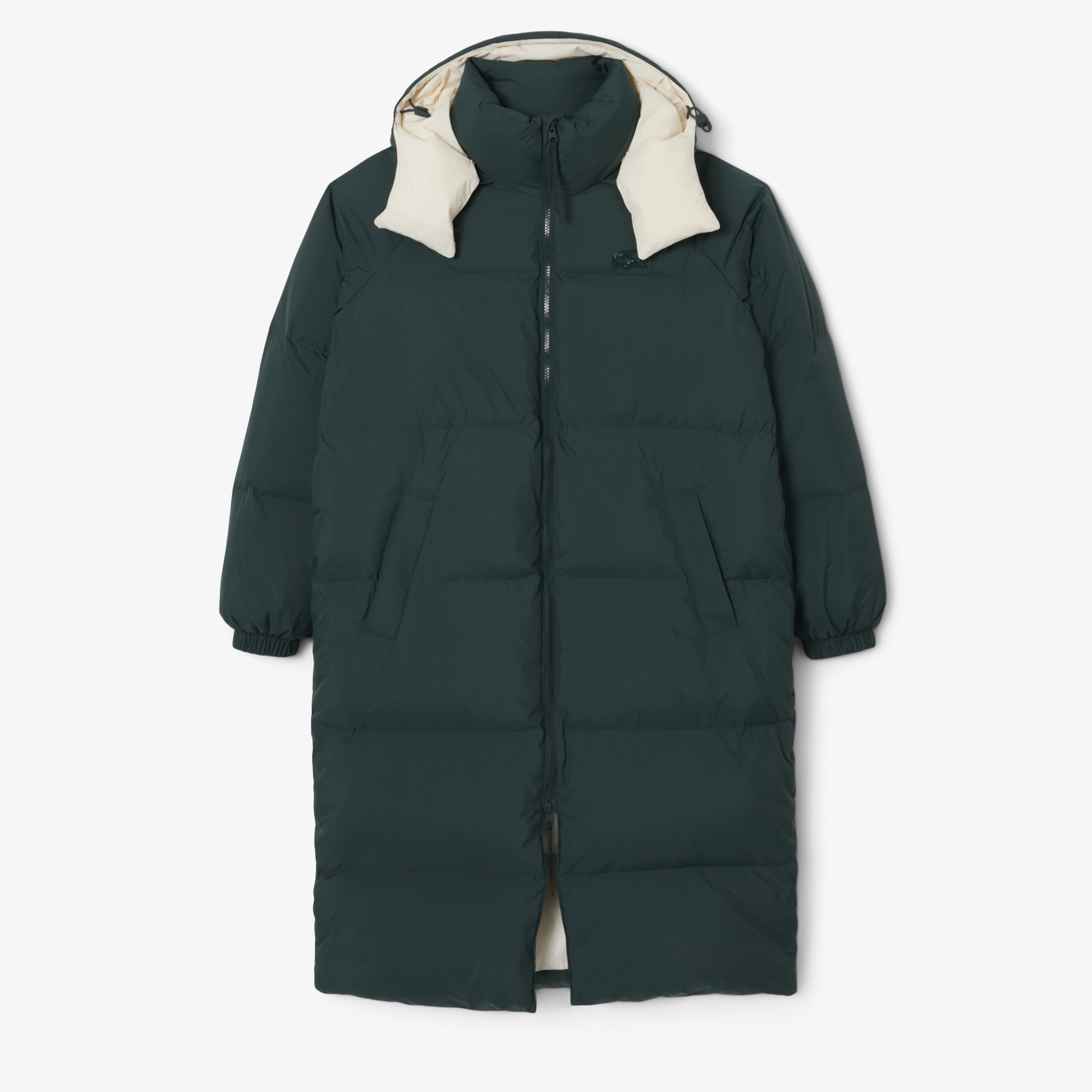 Длинный пуховик Oversize \ Водоотталкивающий нейлон \ Наполнитель из пуха, сертифицированного RDS, из экологически чистых источников \ Капюшон с контрастной подкладкой \ Два кармана на кнопках по бокам, один внутренний карман на молнии \ Глянцевый бренд L