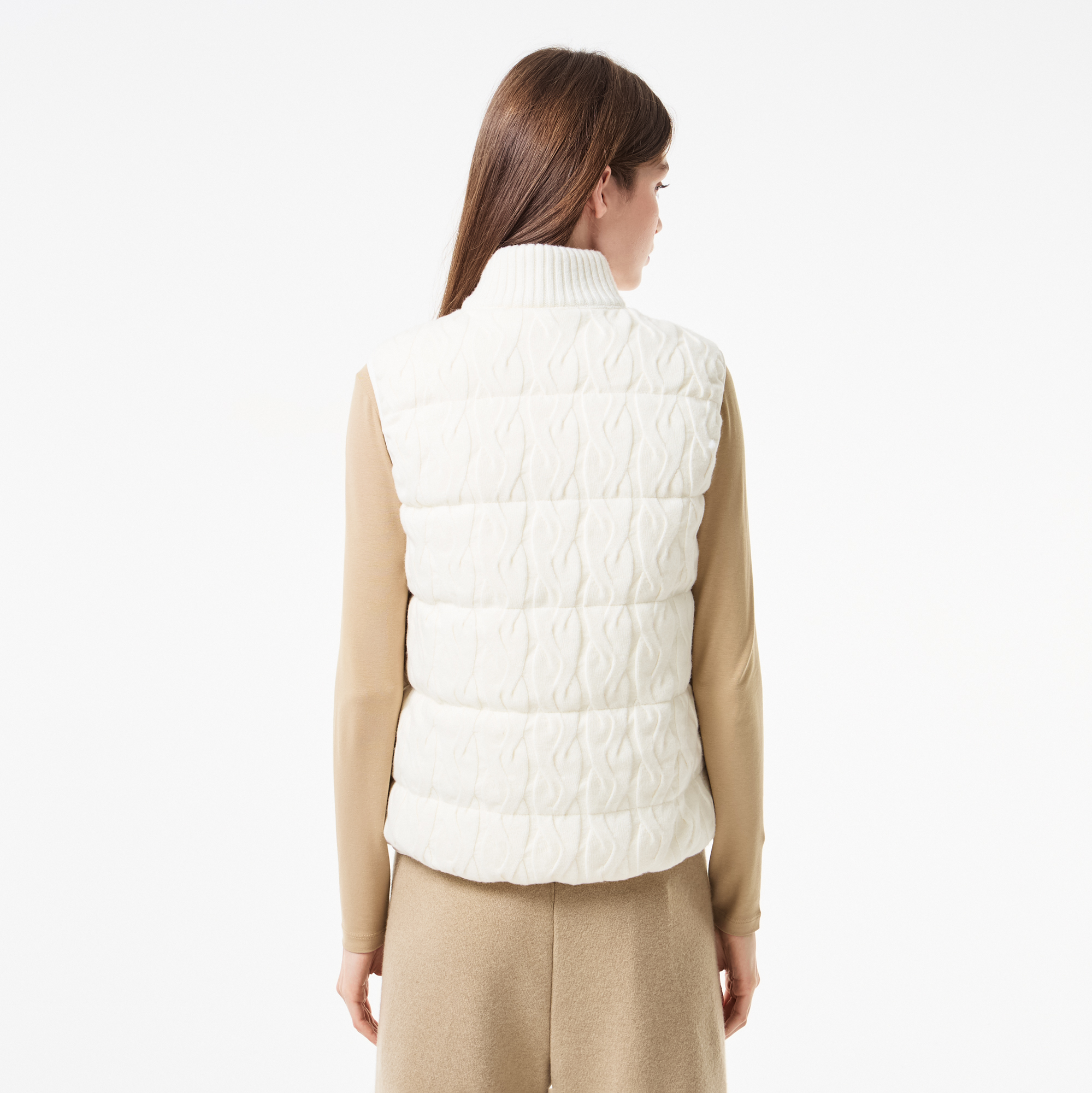 1 сторона вязаная с узором \ 2 сторона стёганая \ Двойная молния \ Высокий ребристый ворот \ Скрытые карманы на молнии \ Материал: Сторона 1 - 40% шерсть 30% вискоза 20% полиамид 10% кашемир;\ Реверс 100% полиамид \ Наполнитель: Пух 90% Перо 10%