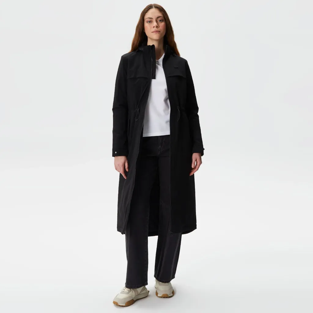 Удлиненная модель\Съемный капюшон\Регулируемая кулиска на талии\Карманы с клапаном\Двойная молния\Логотип на груди в тон изделия\Материал: верх-90% полиамид 10% эластан,подкладка-100% полиэстер\Рост модели 177 см, размер одежды 36