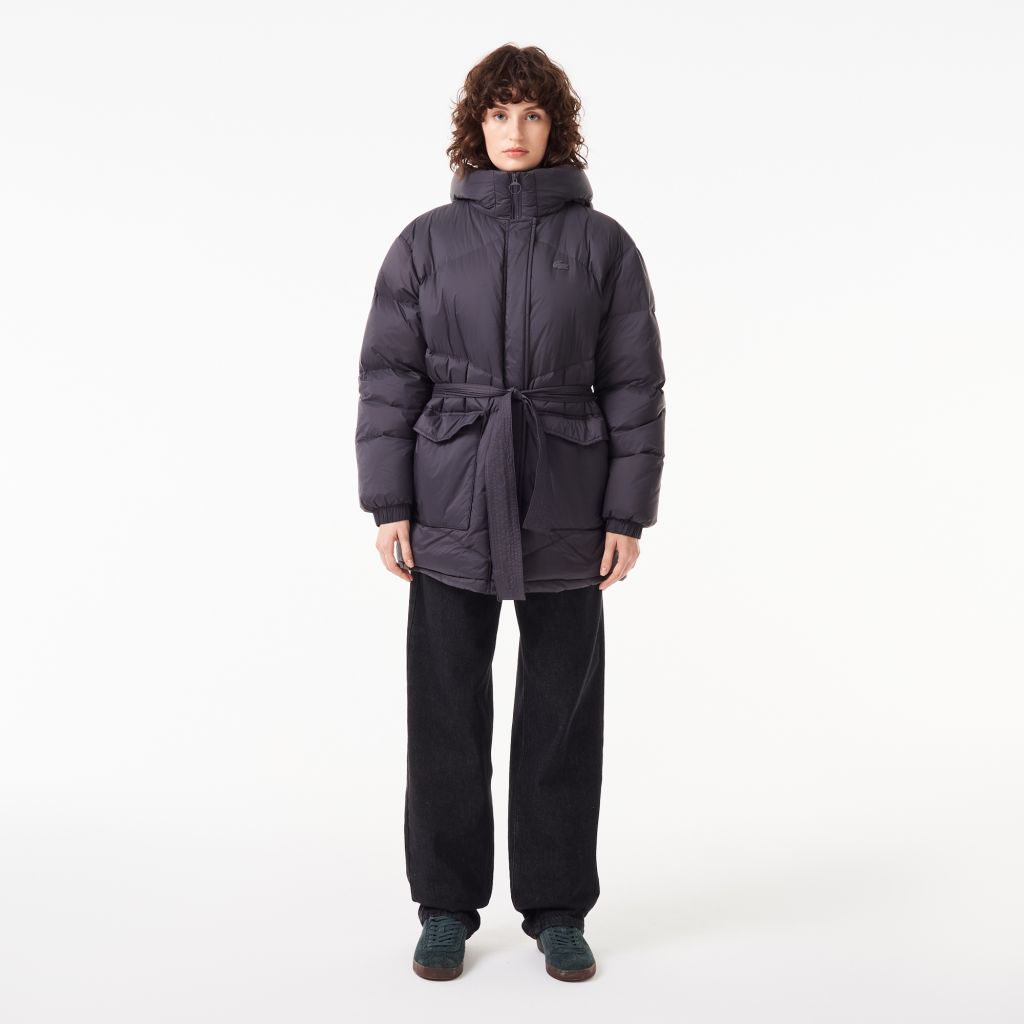 Женский короткий пуховик Lacoste с поясом и высоким воротом
