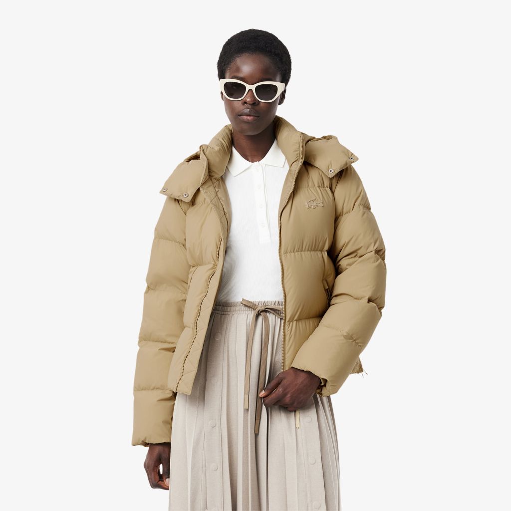 Пуховик с капюшоном свободного покроя \ Переработанная полиамидная тафта, ограничивающая использование сырья \ Наполнитель из утиного пуха \ Завязки на талии и капюшоне \ Глянцевый рельефный крокодил на груди \ Изделие большого размера. Мы советуем вам бр