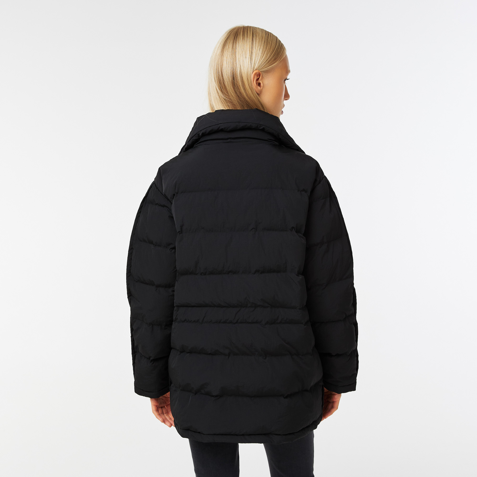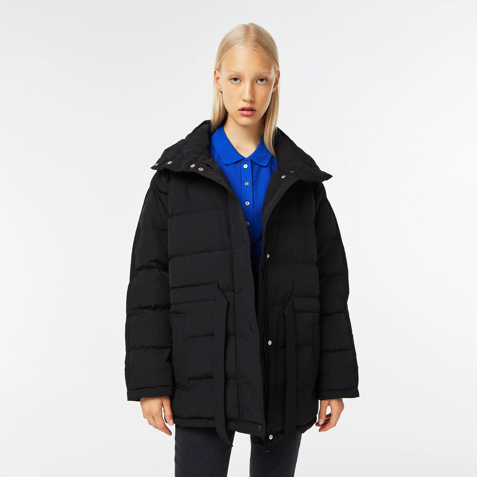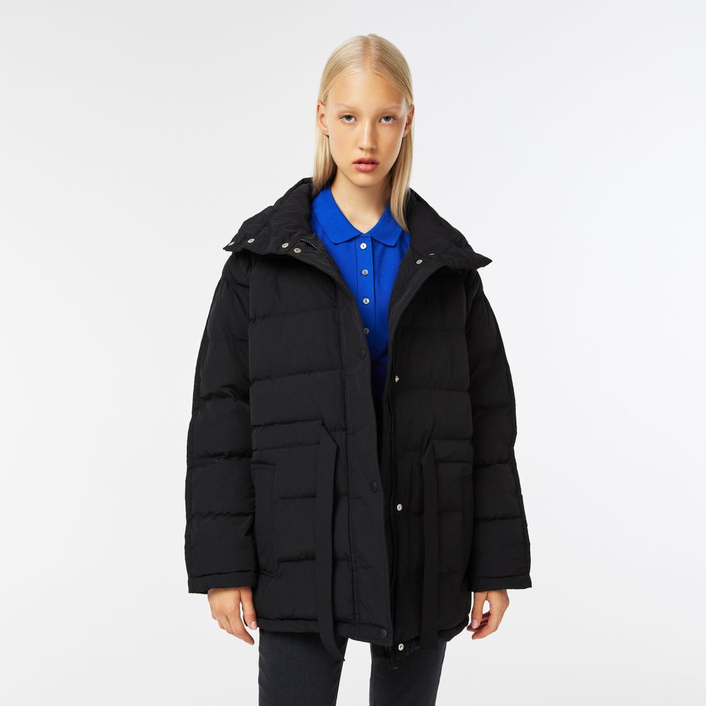 Объемная удлиненная куртка\Застегивается на двойную молнию и кнопки\Регулируемый ремень\Высокий воротник\Прорезные карманы сбоку\Потайной карман на молнии\Логотип в тон изделия на груди\Материал: 100% полиэстер