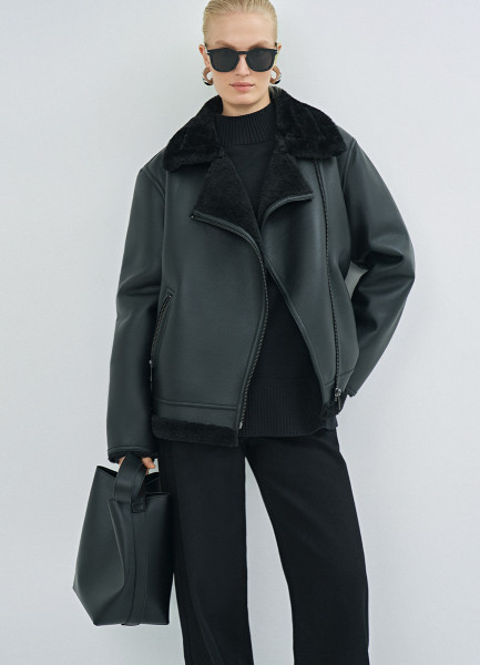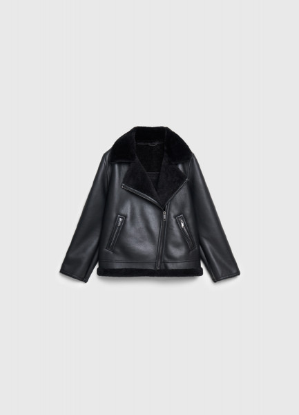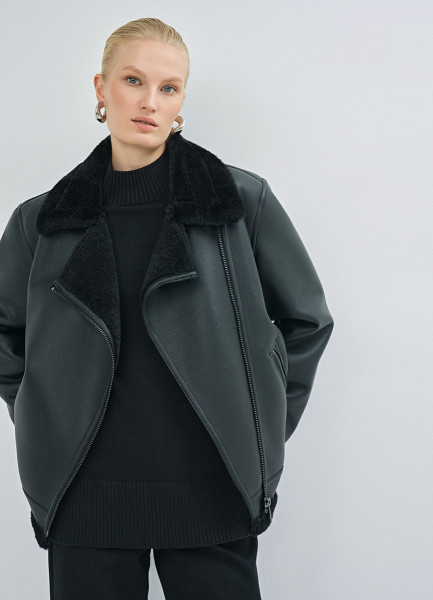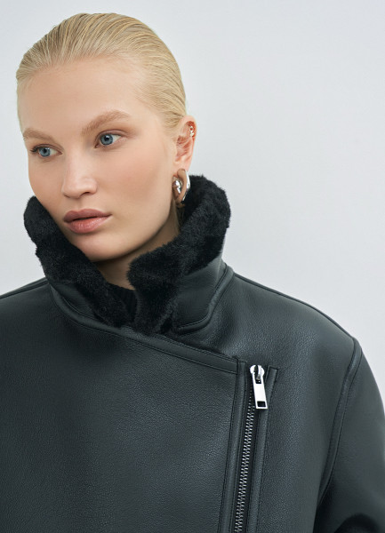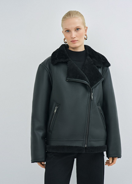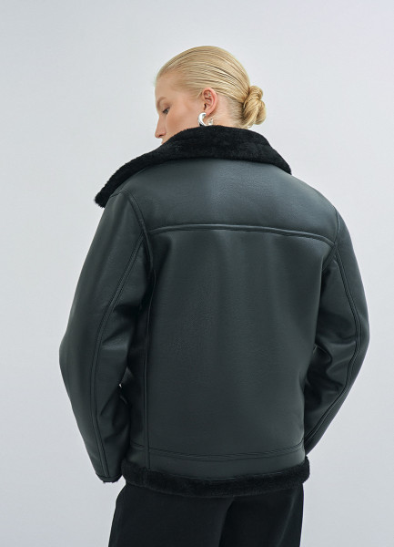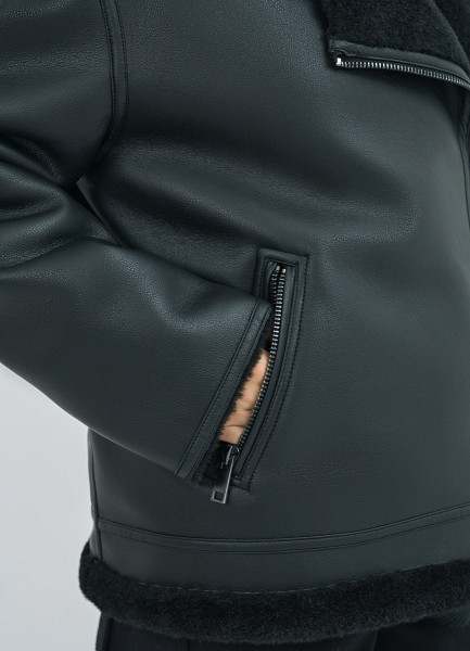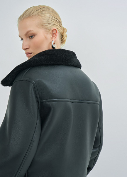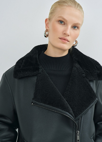 Дублёнка с воротником из искусственного меха, Черный